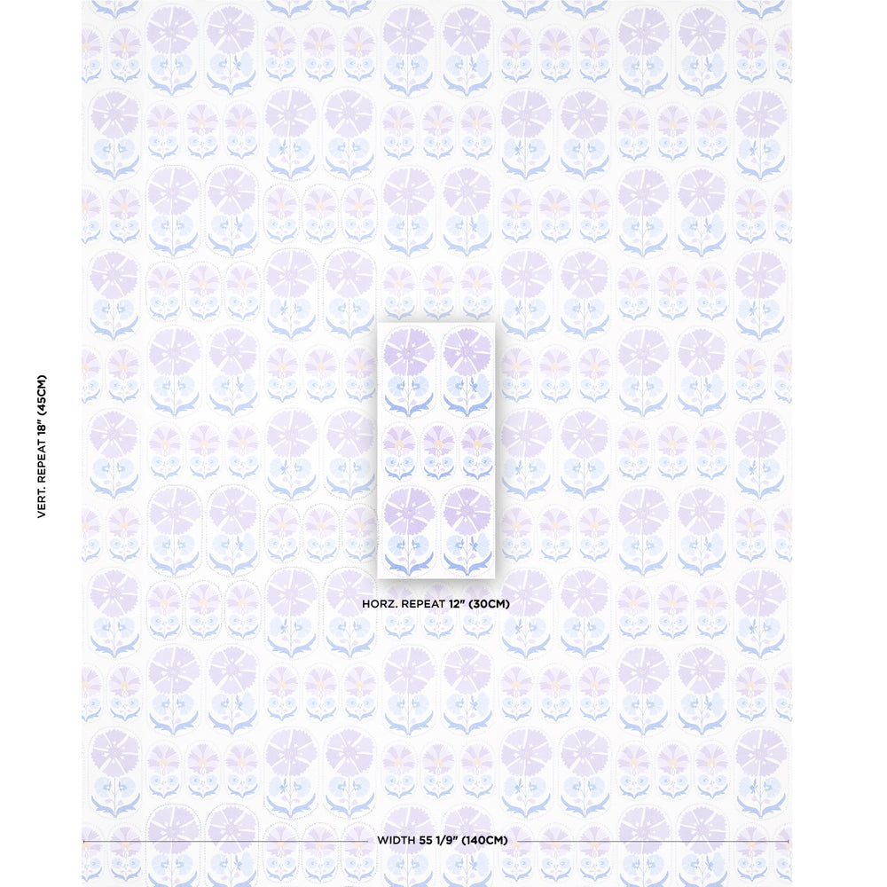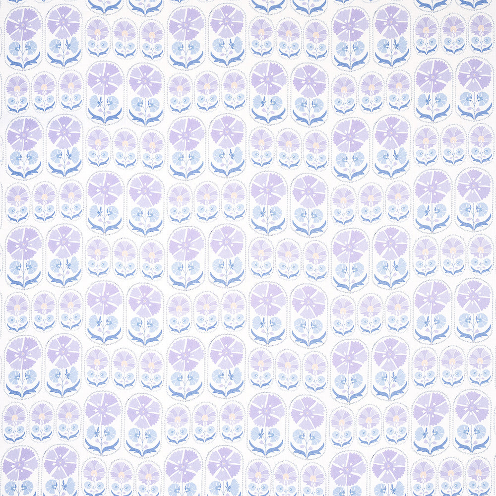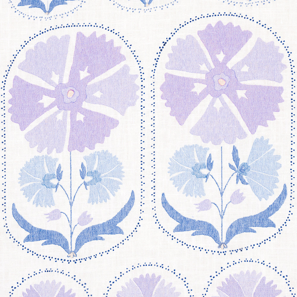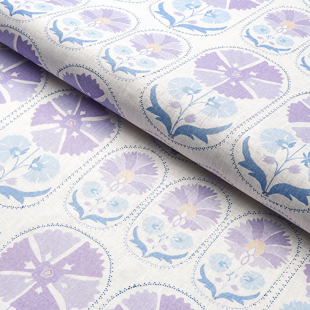 Inspired by antique Suzani textiles, Anjuna Floral Linen Print in lilac was created by our in-house design studio. Irregular stylized flowers give this mid-scale pattern the look of a hand-block print. Use this exotic floral fabric for furniture, pillows or window treatments. Also available as a wallpaper. -