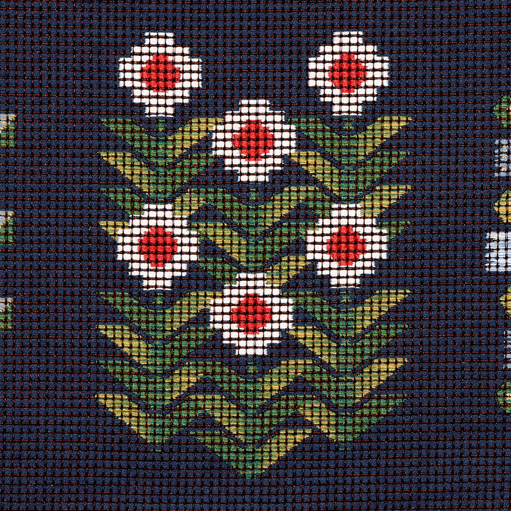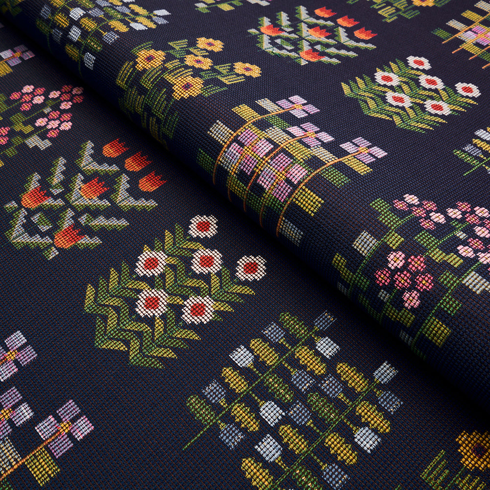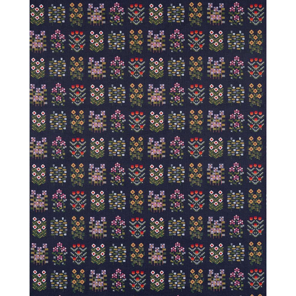 Based on original artwork that was hand-drawn in our studio, Annika Floral Tapestry in multi-on-navy derives its charm and geometric simplicity from early 20th-century Swedish textiles and cross-stitch samplers. A sturdy tapestry weave gives this mid-scale floral fabric the look of needlepoint, along with a wonderful hand.
