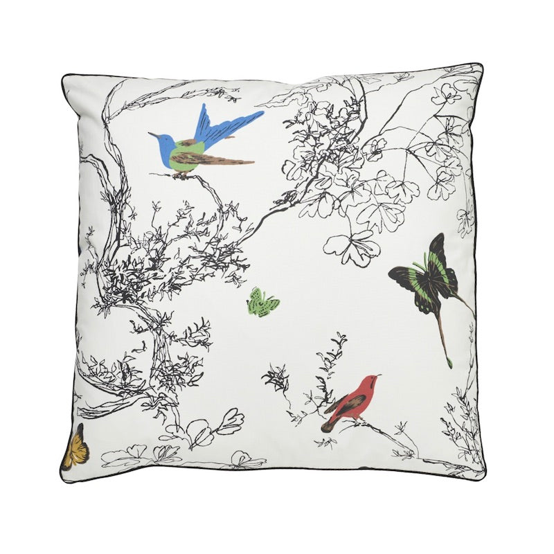 This pillow features Birds & Butterflies. This celebrated pattern derives from a handprinted 1960s wallcovering in our archives. Its whimsical creatures take flight amid twining foliage. Pillow is finished with a welt in Cedric Cotton Lip Cord Narrow. Cord contents: 48% Fibranne, 36% Cotton, 14% Polyester, 2% Nylon. Pillow includes a feather/down fill insert and hidden zipper closure. -