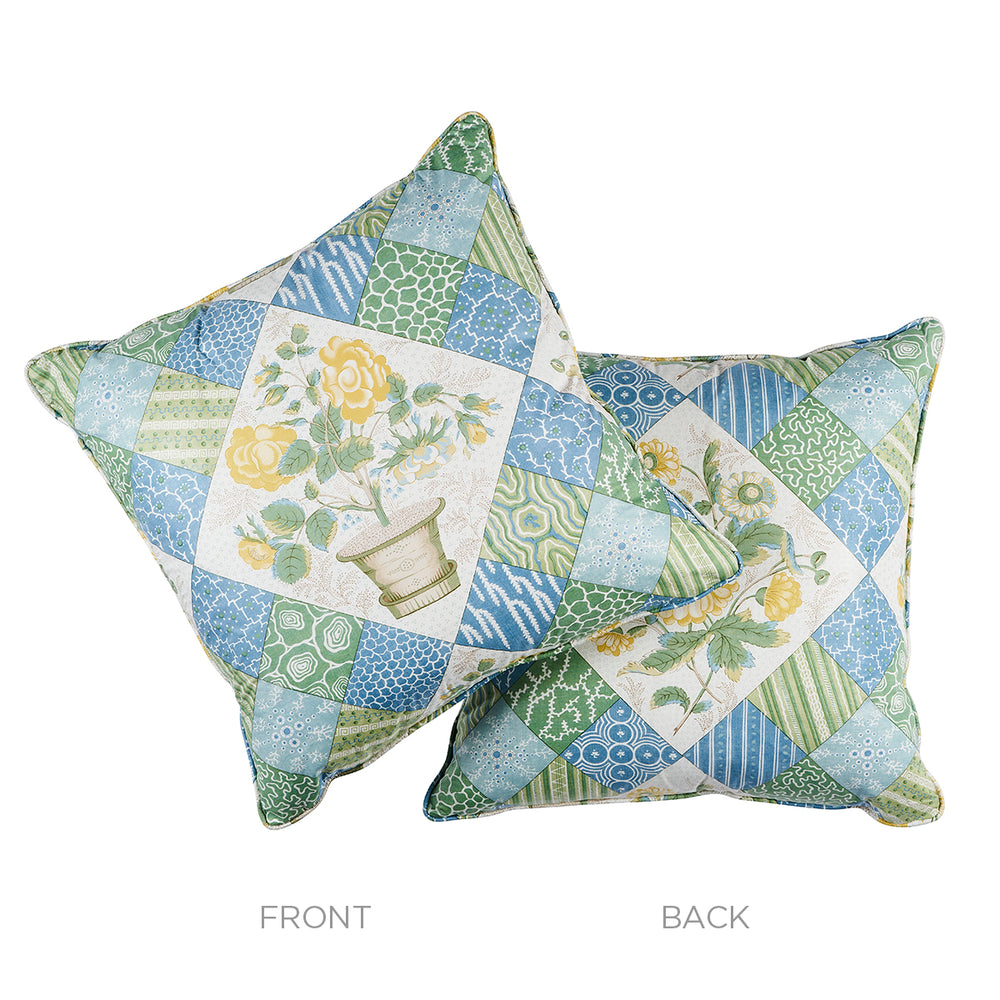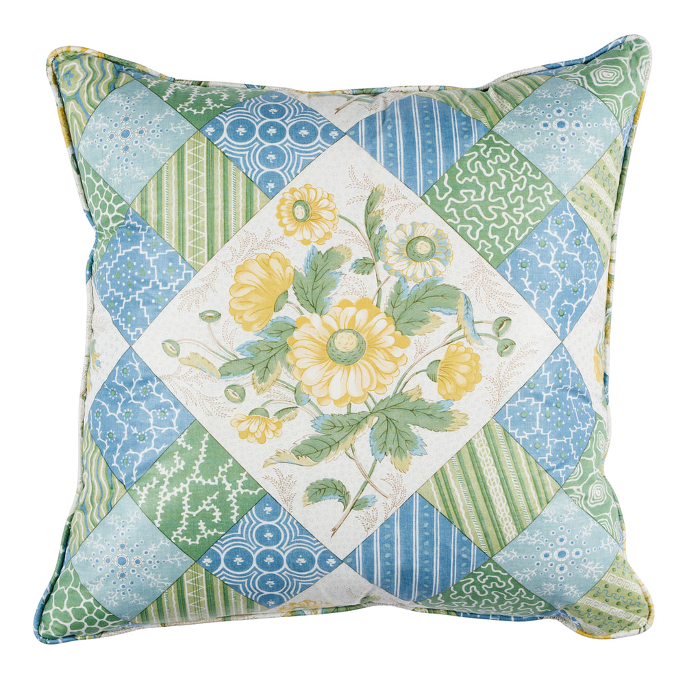 This pillow features Caldwell Patchwork with a self welt finish. Caldwell Patchwork Chintz in yellow-and-cornflower is a trompe l‘oeil quilted pattern where lovely floral bouquets are framed by an intricate and charming patchwork of graphic patterns. The fabric’s light chintz gives the rustic design a sophisticated finish. Pillow includes a feather/down fill insert and hidden zipper closure. -