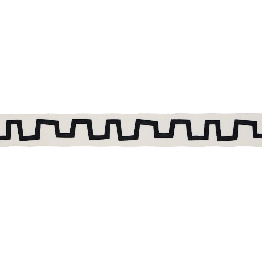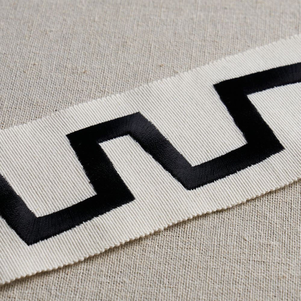 Corbu Tape is an off-kilter, arty take on a Greek key inspired by a Jean Cocteau drawing around a doorway in the South of France. Designed by David Kaihoi, this trim features lustrous embroidery on a cotton ground with a subtle grosgrain texture. -