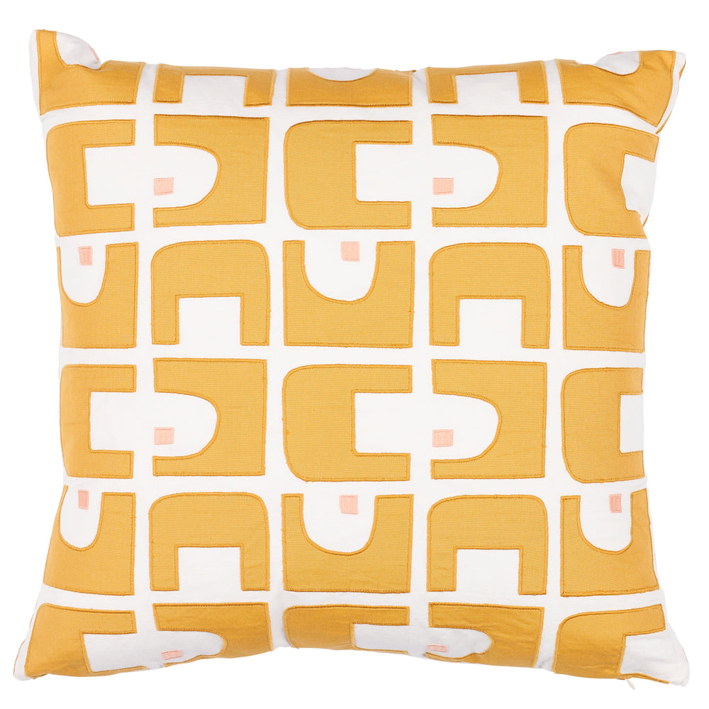 This pillow features Den Applique by Hadiya Williams for Schumacher with a knife edge finish. Hadiya Williams’ Den Appliqué in ochre is a wonderfully imaginative irregular-grid pattern based on paper cutouts. Abstracted architectural shapes are appliquéd onto a cotton-linen ground and accentuated by embroidered elements. Pillow includes a feather/down fill insert and hidden zip closure. -