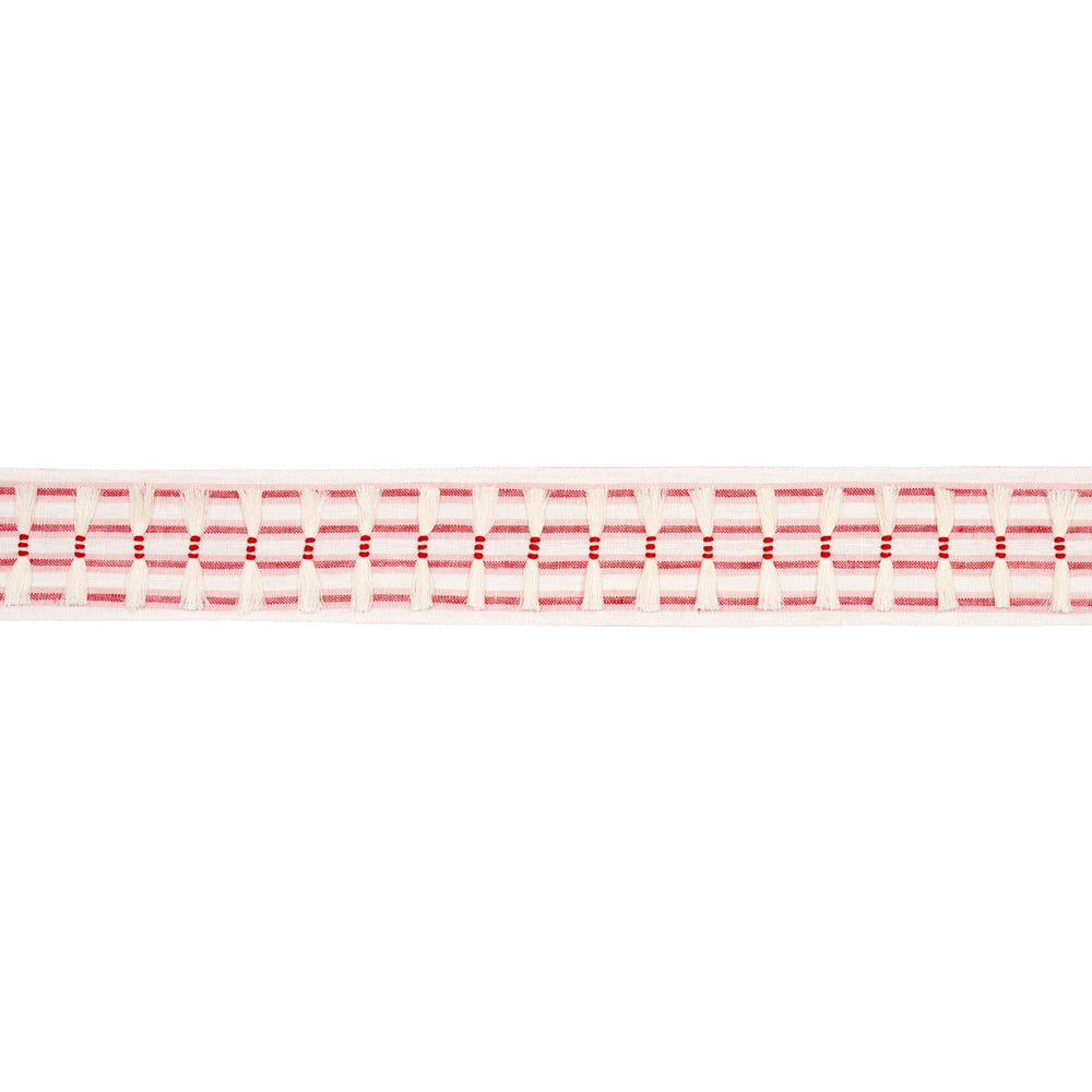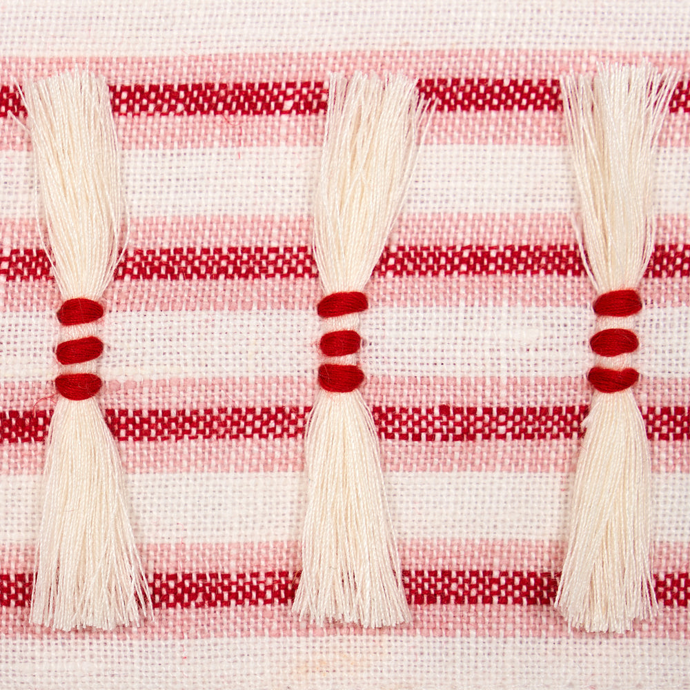 Eyelash Fringe in red is a woven ticking-stripe tape with a flirty, hand-clipped eyelash fringe detail. A lovely combination of linen and cotton, this eye-catching tape adds a unique textural element to pillows, upholstery and window treatments. -
