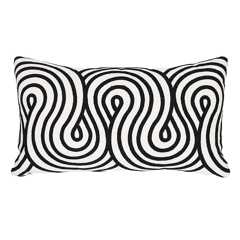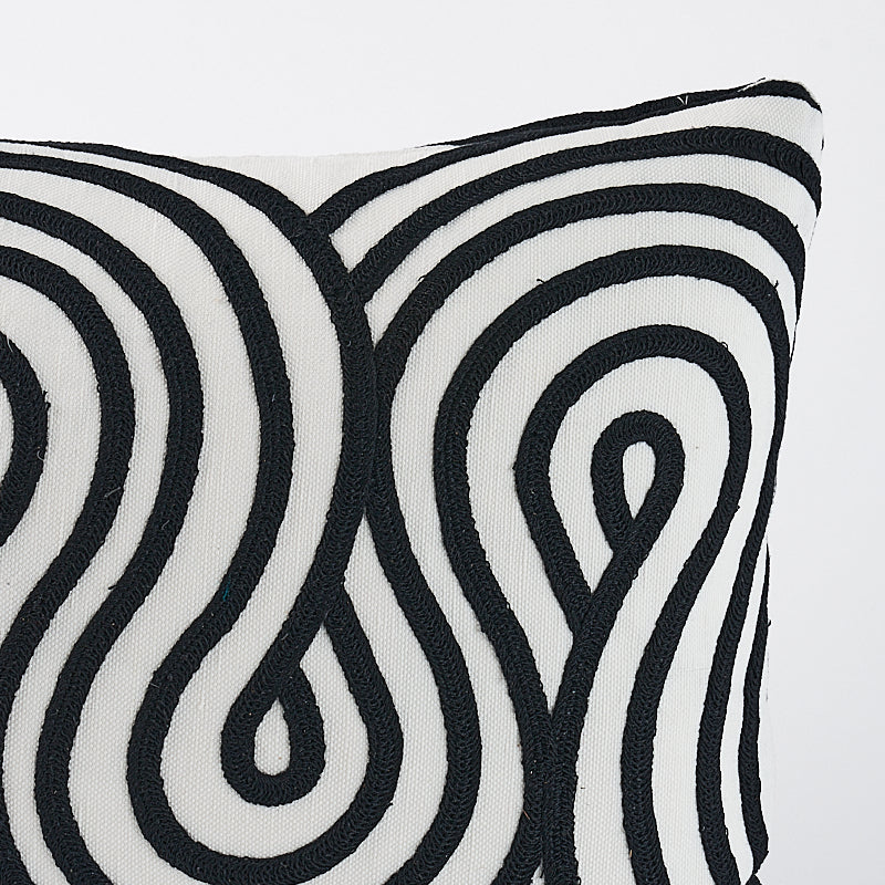 This pillow features Giraldi Embroidery with a knife edge finish. Rendered in chain stitched embroidery on a linen grown, this ribbon-candy-esque stripe combines a sense of movement with tactile dimension. Pillow includes a feather/down fill insert and hidden zipper closure. -