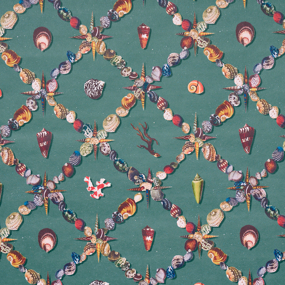 An artful collage of shells and marine curiosities, Grotto Treillage in multi-on-teal is a playful take on a traditional trellis. Created by Charlap Hyman & Herrero with Pilar Almon and beautifully printed on a fibrous ground, this extraordinarily detailed mid-scale design adds a sophisticated coquillage element to any room.
