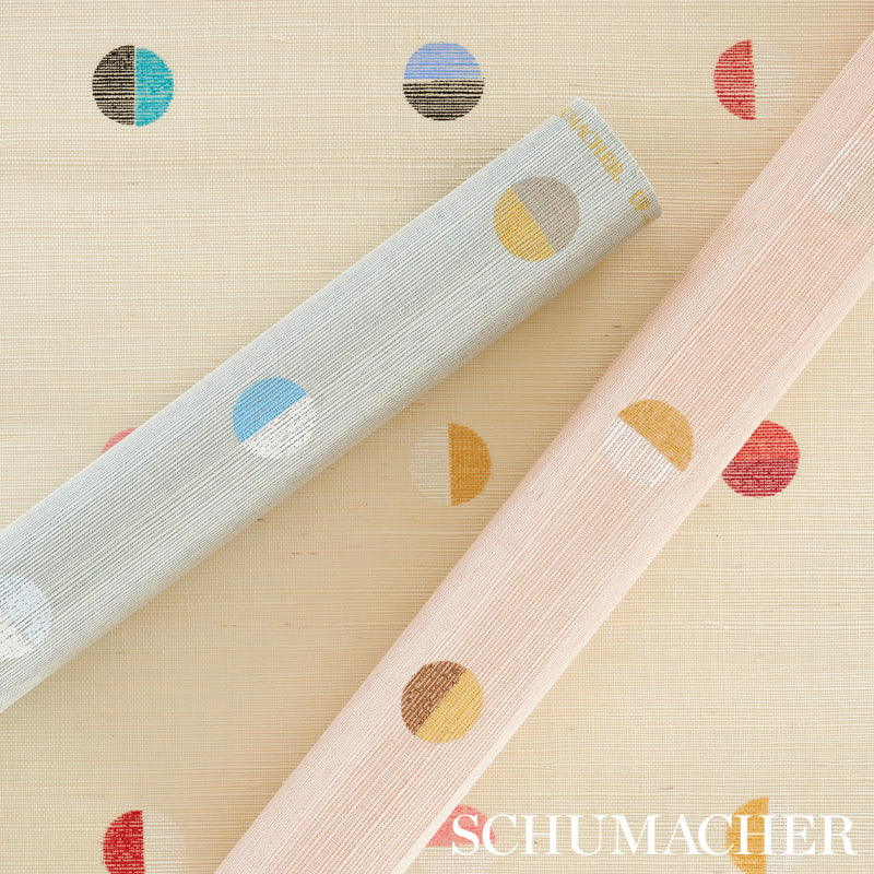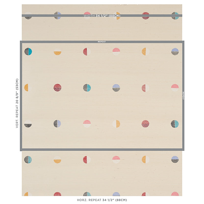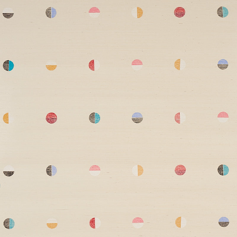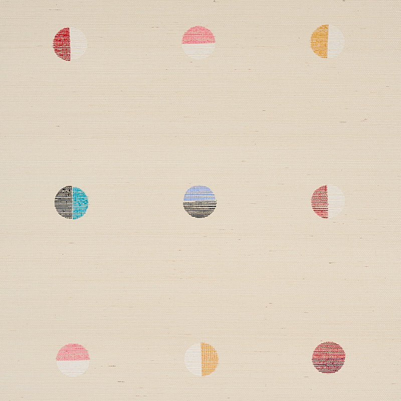 Joshua Tree Hand Printed Sisal wallpaper in multi-on-ivory was designed by Caroline Z Hurley in her Brooklyn studio. Screen printed by hand on a textural ground, the slightly skewed moons capture the spirit of handcrafted goods. -