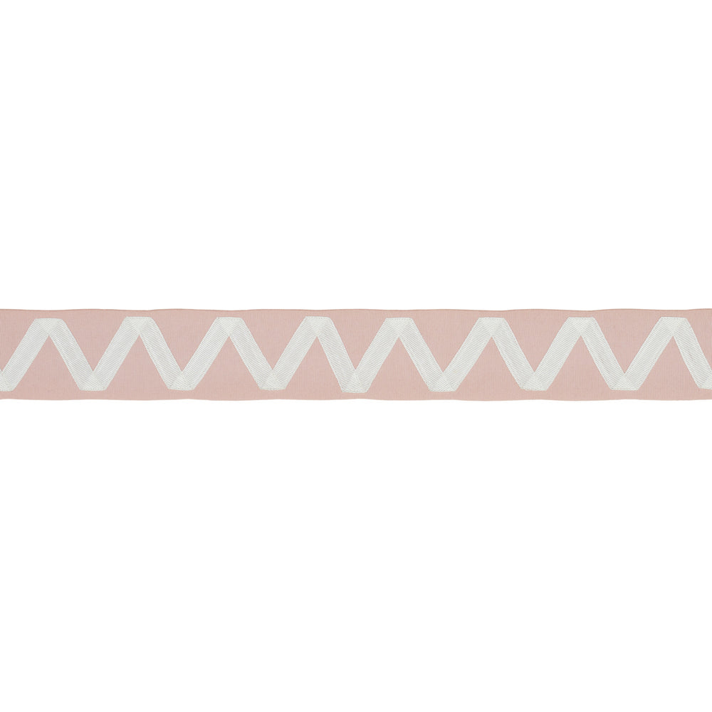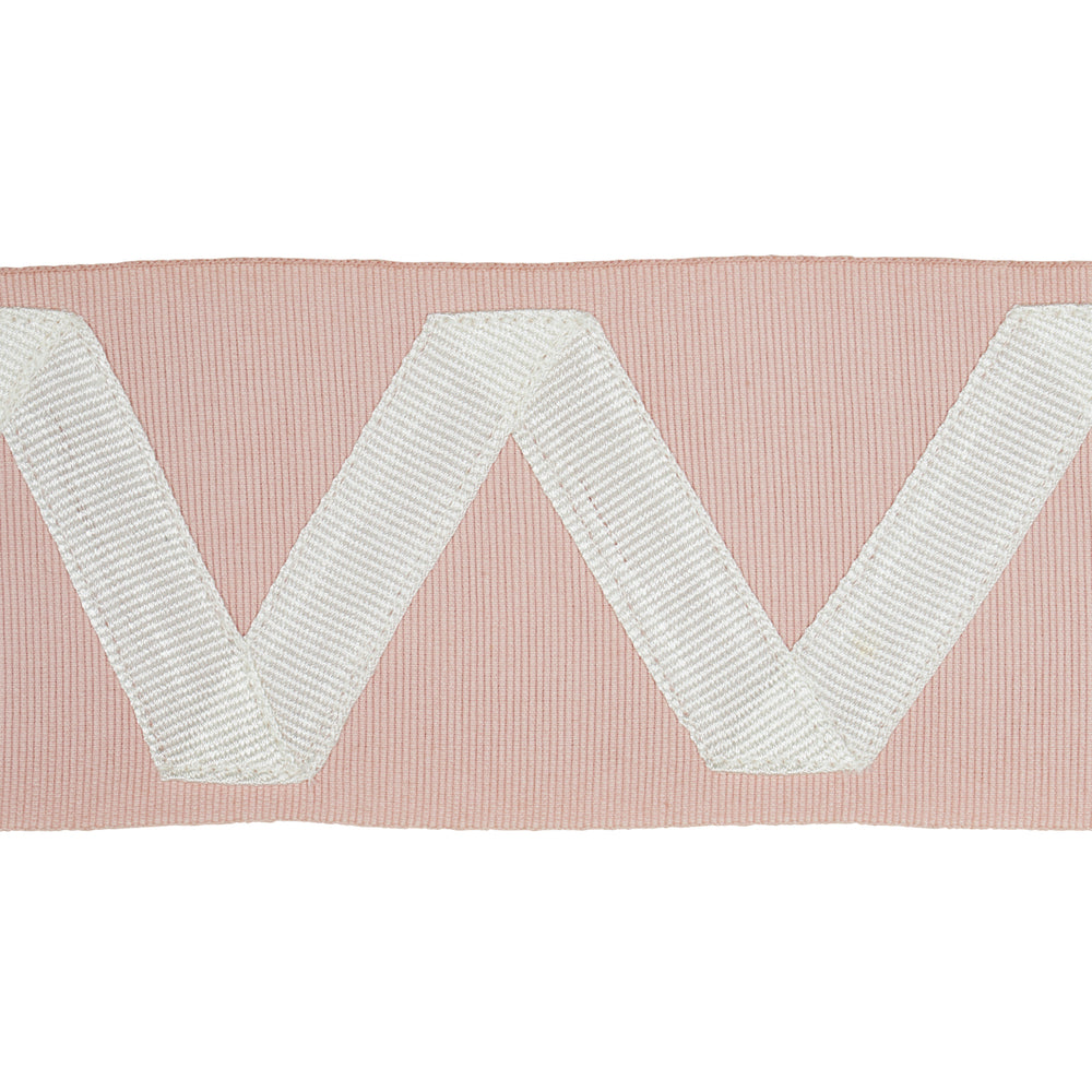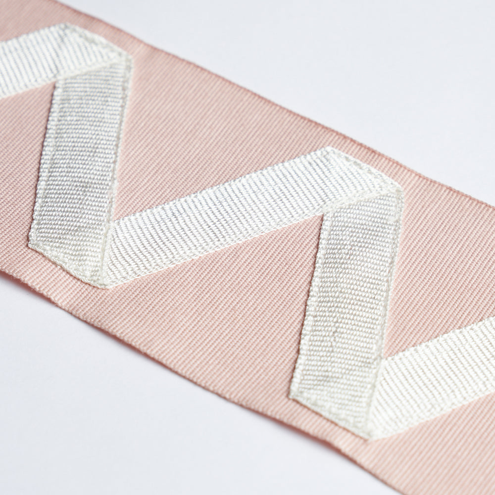 Elegant yet delightfully unfussy, Legere Tape in ivory-on-blush features an appliquéd zigzag stripe on a simple cotton ground. Rendered in crisp grosgrain ribbon, this design adds texture, graphic appeal and decorator polish to pillows, upholstery and window treatments. -