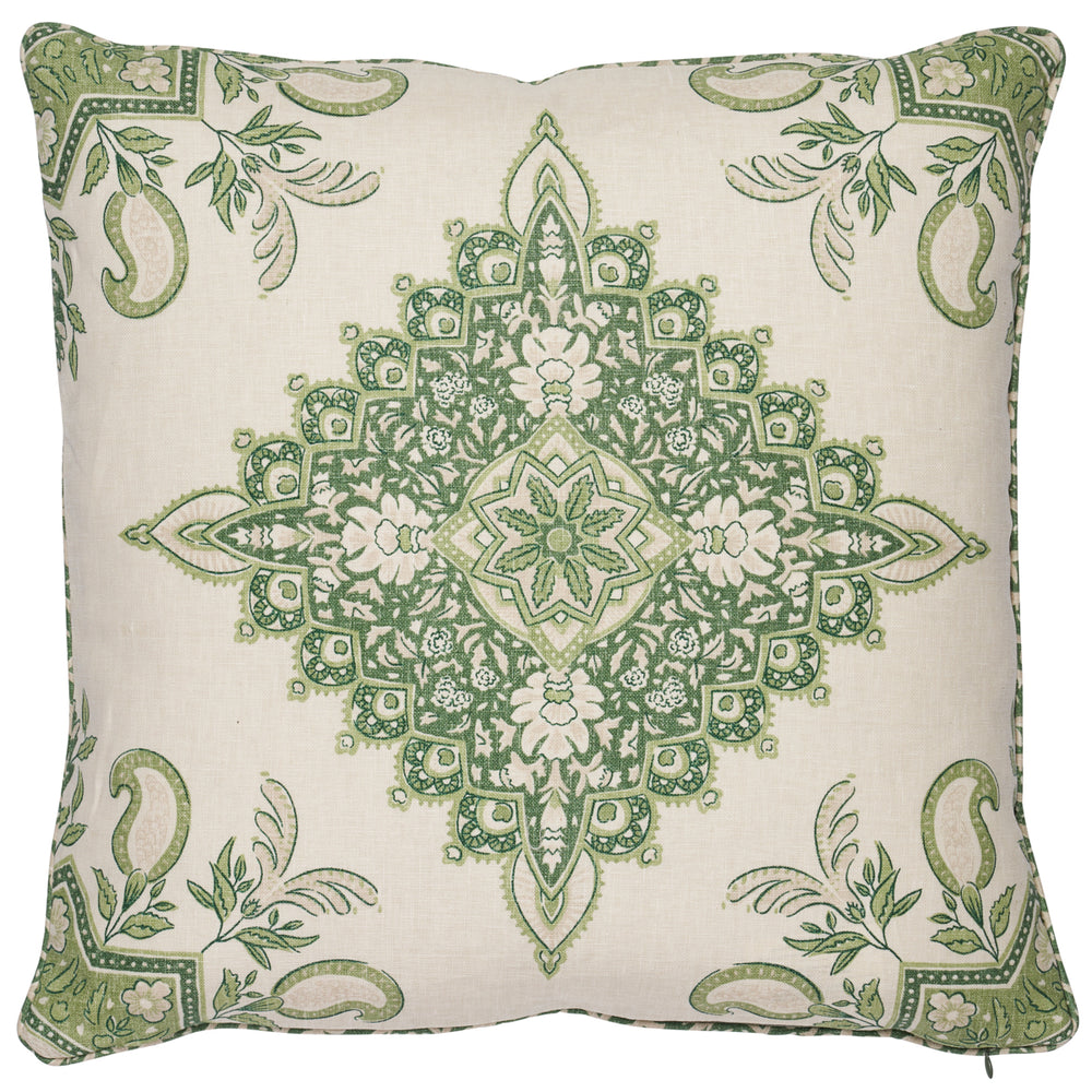 This pillow features Montecito Medallion by Mark D. Sikes for Schumacher with a self welt finish. This stunning large-scale medallion in leaf green evokes timeless motifs from India and Turkey for a chic, global vibe. Pillow includes a feather/down fill insert and hidden zipper closure.