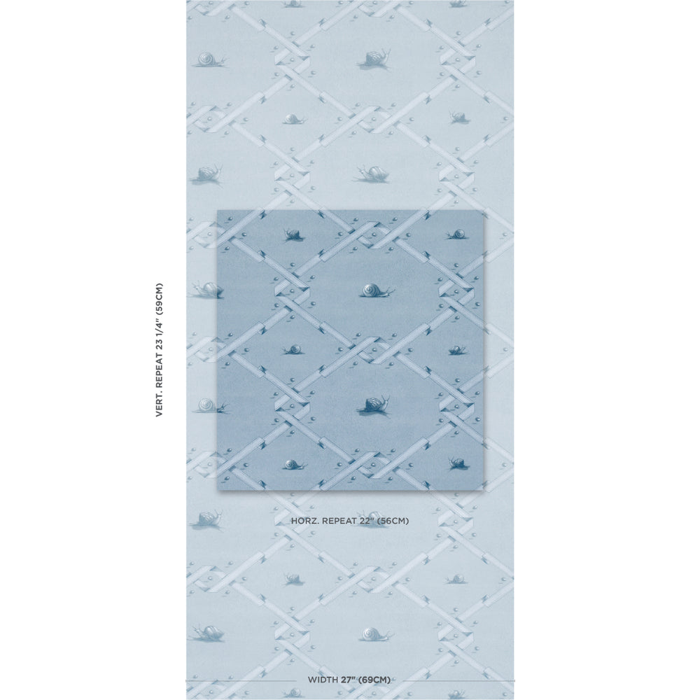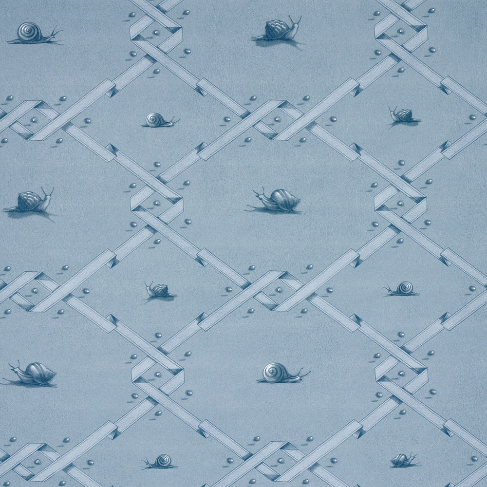 A trompe l’oeil ribbon lattice design enhanced by trailing snails and pearl details, Ouvrez-Moi in blue is a playful, irreverent take on a traditional trellis. Created in collaboration with Charlap Hyman & Herrero with Pilar Almon and beautifully printed on a fibrous ground, this marvelous mid-scale wallpaper adds surrealist wit and unexpected whimsy to any room. -