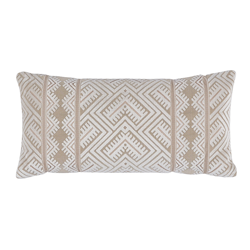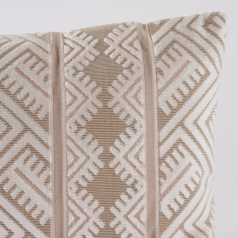 This pillow features Parvin Velvet with a knife edge finish. Parvin Velvet in pearl is a luxe cut velvet that combines several weaving techniques to create a truly extraordinary work of art. With a chic geometric pattern interspersed with stripes, this upholstery weight fabric has a rug-like look that’s both cozy and elegant. Pillow includes a feather/down fill insert and hidden zipper closure. -