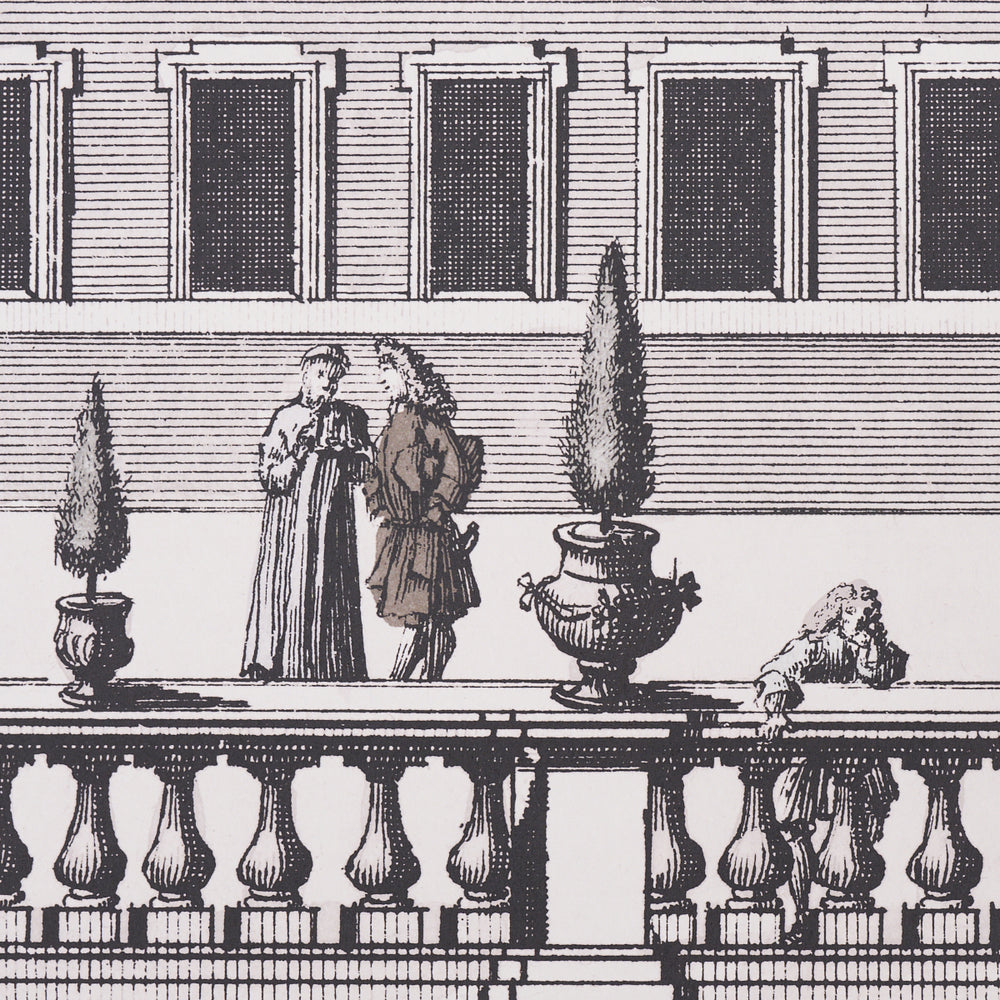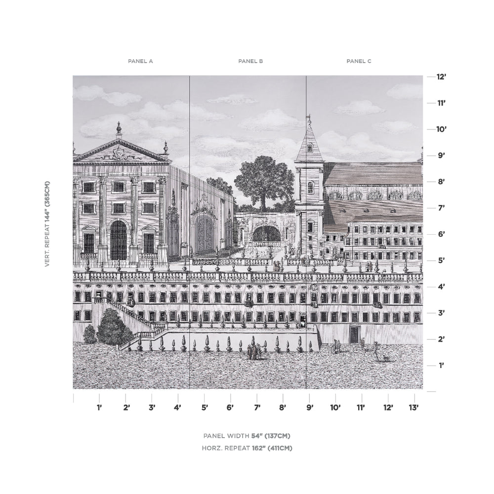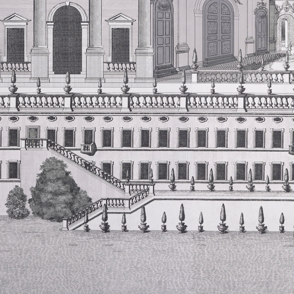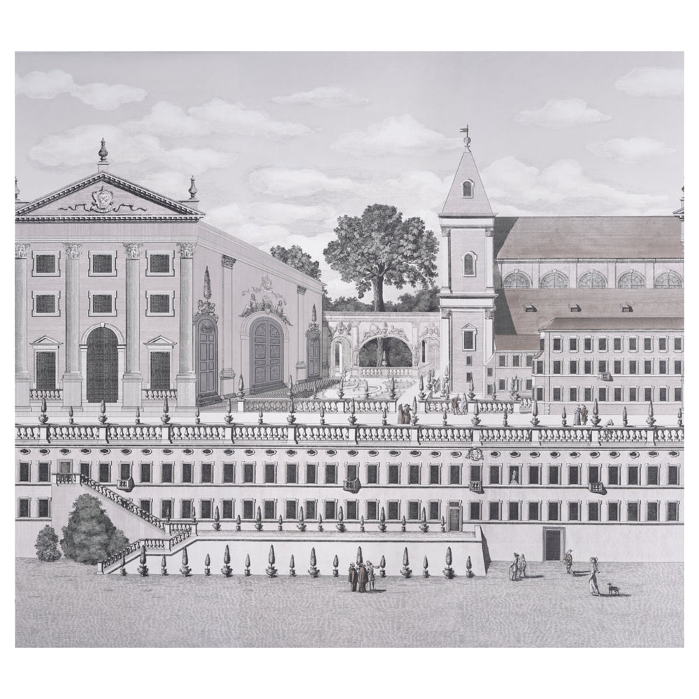 Inspired by an antique document, Piazza Firenze in grisaille is a splendid three-panel wallpaper set designed by Johnson Hartig of Libertine. This splendid architectural panorama is beautifully detailed and printed on uncoated paper for a marvelous antique effect. -