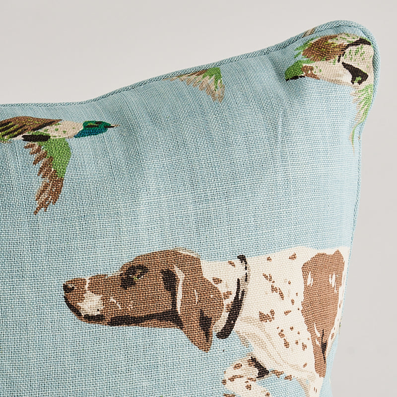This pillow features Pointers with a self welt finish. With its field dogs and fluttering quail, sky-colored Pointers is a classic hunting scene that speaks to lovers of canines and country life. A painterly print on a soft, linen ground, this fabric makes a wonderful companion for other patterns. Pillow includes a feather/down fill insert and hidden zipper closure. -