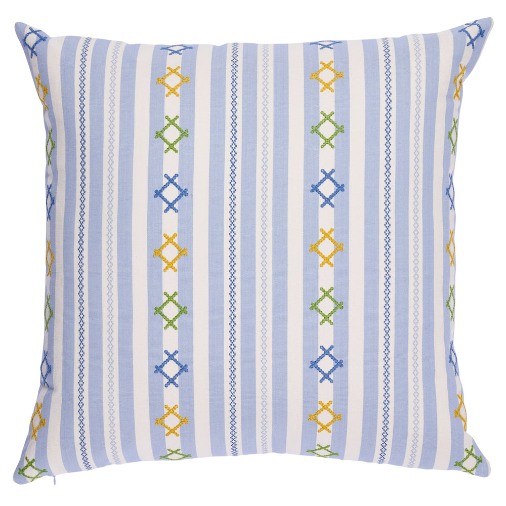 This pillow features Rhodes Stripe with a knife edge finish. Inspired by Ukrainian needlework, Rhodes Stripe in sky is a woven stripe overlaid with charming, cross-stitched flourishes that take it from ordinary to extraordinary. Pillow includes a feather/down fill insert and hidden zipper closure. -
