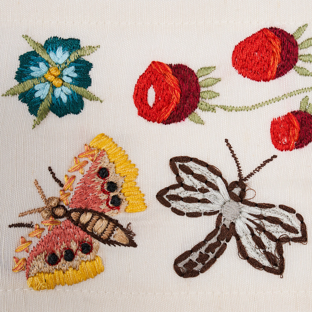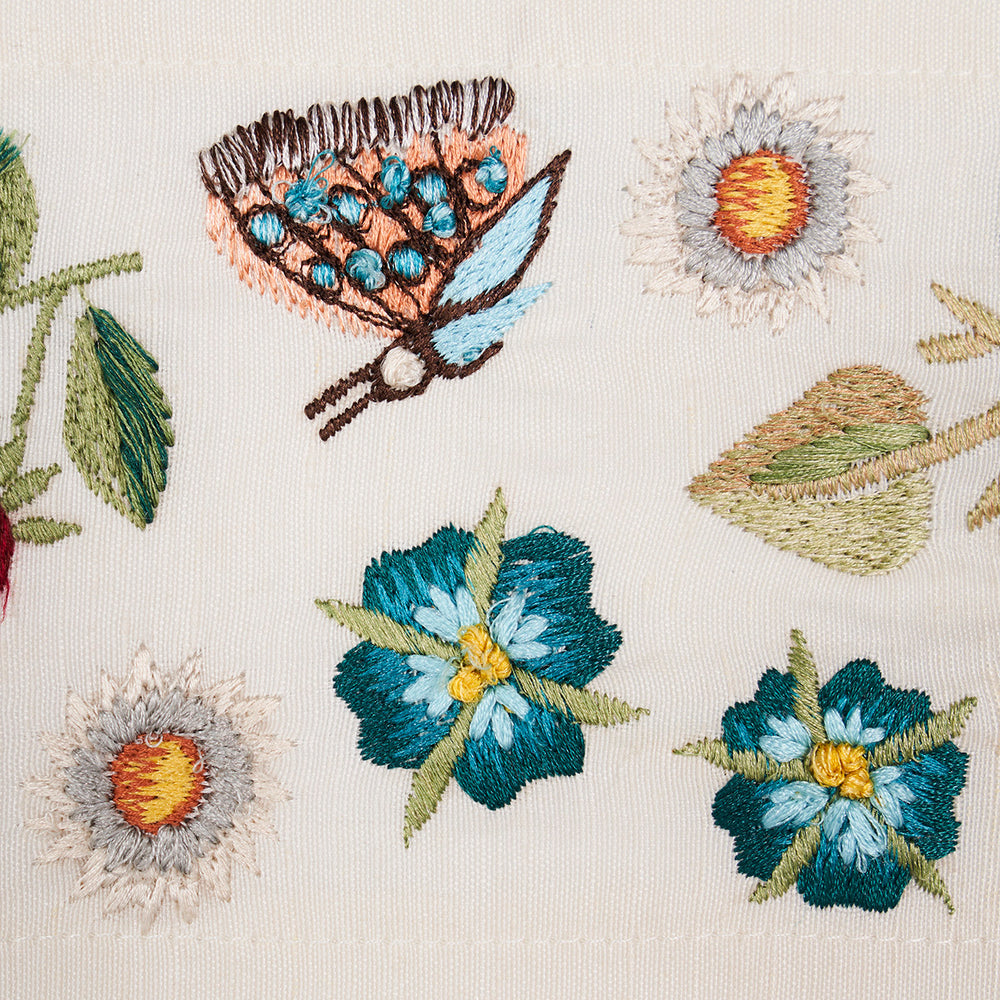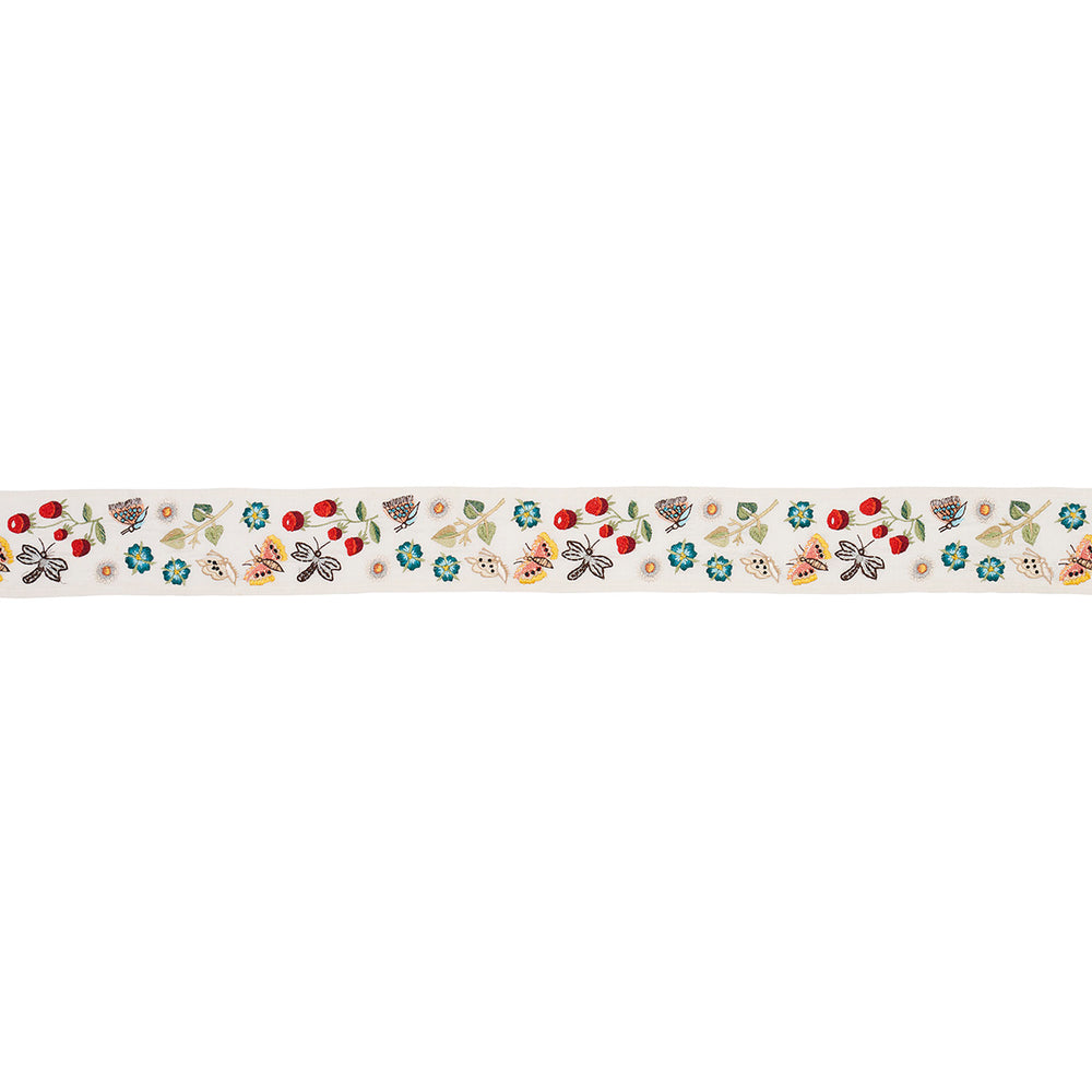This charming multicolored tape features fanciful flora, butterflies and dragonflies, each painstakingly hand-stitched using hand-dyed yarns on a fine silk-linen ground. A tour de force of artistry and handwork, Royal Silk Embroidery Trim adds a lighthearted, luxe detail to pillows, upholstery and window treatments. Inspired by our iconic Royal Silk Embroidery, a showstopping fabric in the Schumacher Masterpieces collection, this lavish design is derived from a gown worn by Queen Elizabeth I in a 1599 portrait painted by Nicholas Hilliard.