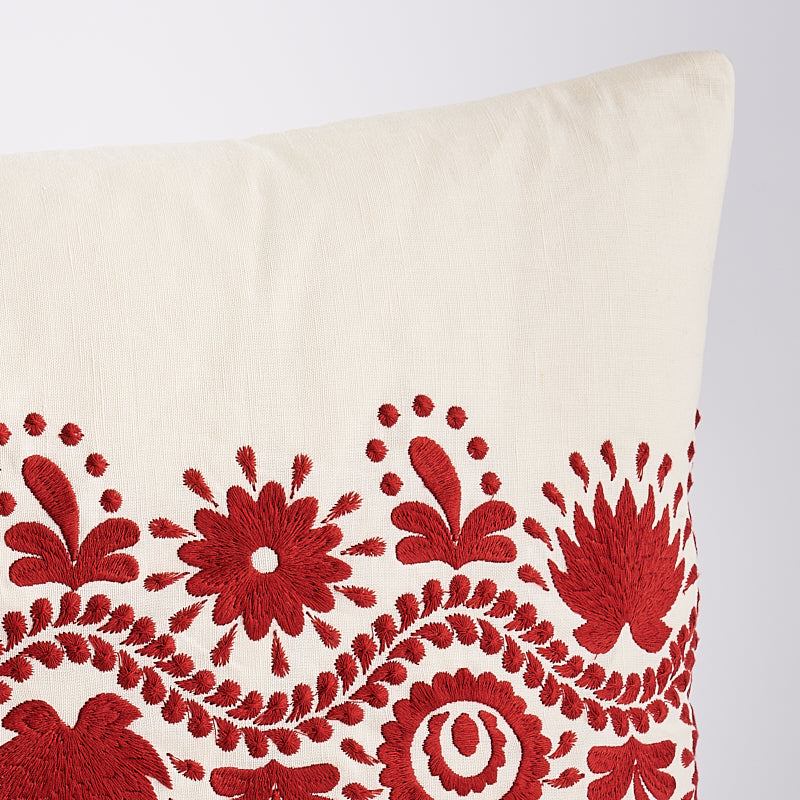 This pillow features Theodora Embroidery with a knife edge finish. Inspired by the folkloric embellishments on an antique Ukrainian blouse, Theodora Embroidery in red features a pair of vertical floral serpentine stripes stitched on a hand-dyed linen ground. Pillow includes a feather/down fill insert and hidden zipper closure. -