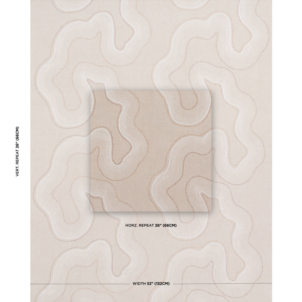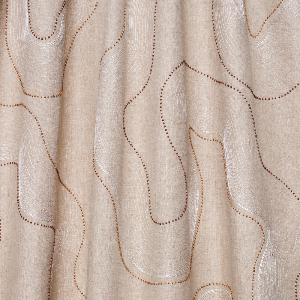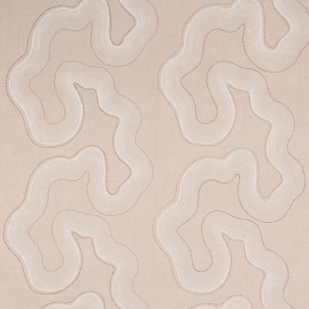 WITH IRREGULAR, CURVED FORMS, THIS ABSTRACT, UNDULATING PATTERN IN NATURAL IS EMBROIDERED ON A SHEER LINEN GROUND AND EMBELLISHED WITH DELICATE BEADING. -