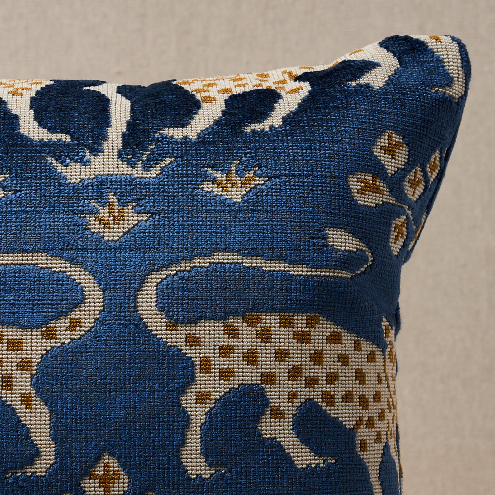 This pillow features Woodland Leopard Velvet with a self welt finish. A host of historic paintings and textiles served as source material for this fabulously stylized leopard and tree motif. The midscale mirrored repeat design combines loop-and-cut pile sections that make the trees and big cats stand out in even sharper relief against the background. Pillow includes a feather/down fill insert and hidden zipper closure.