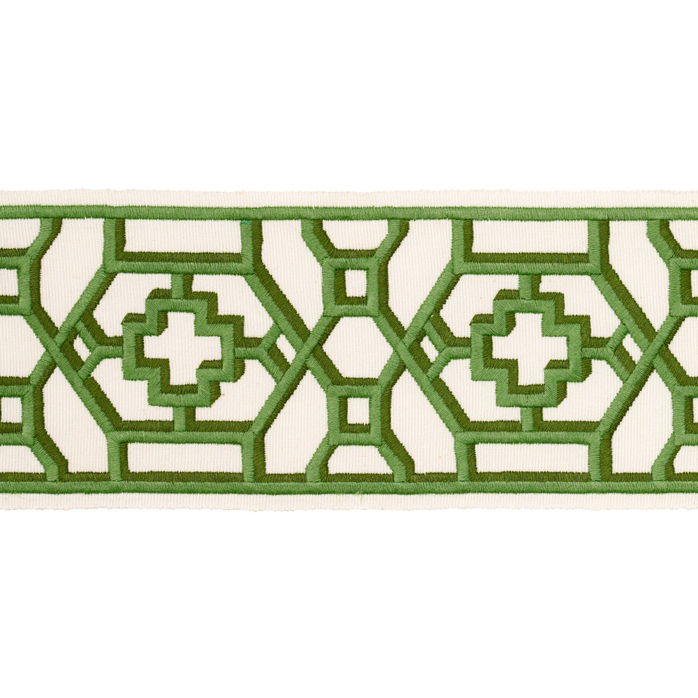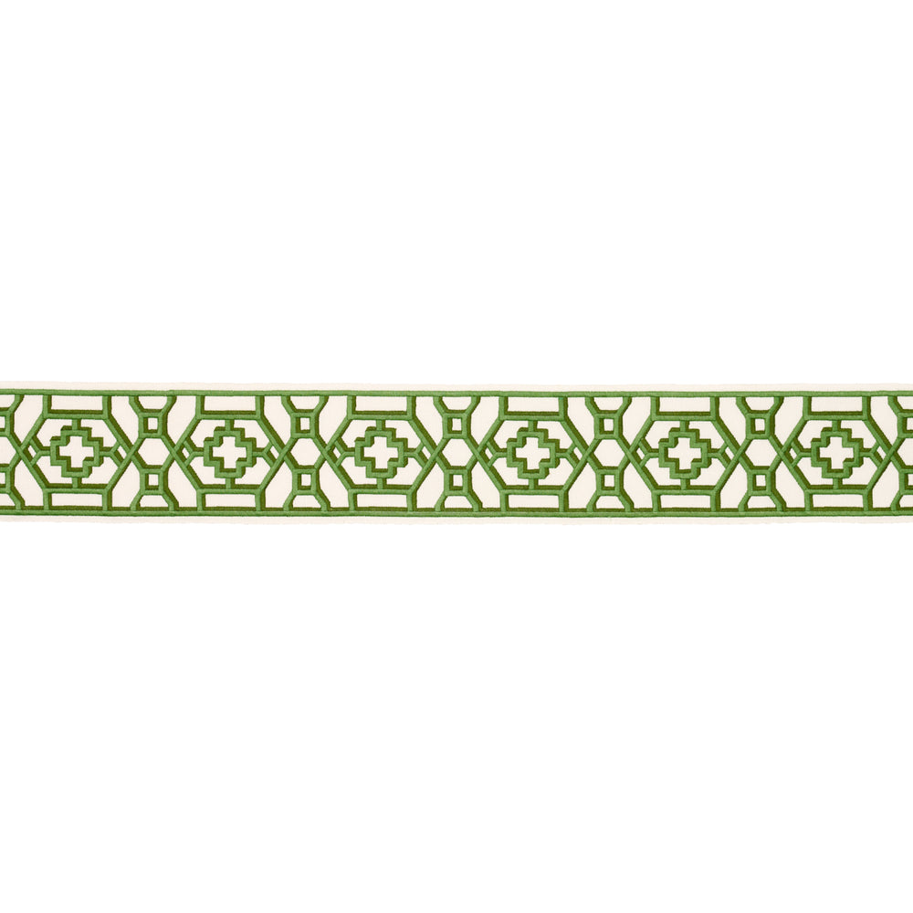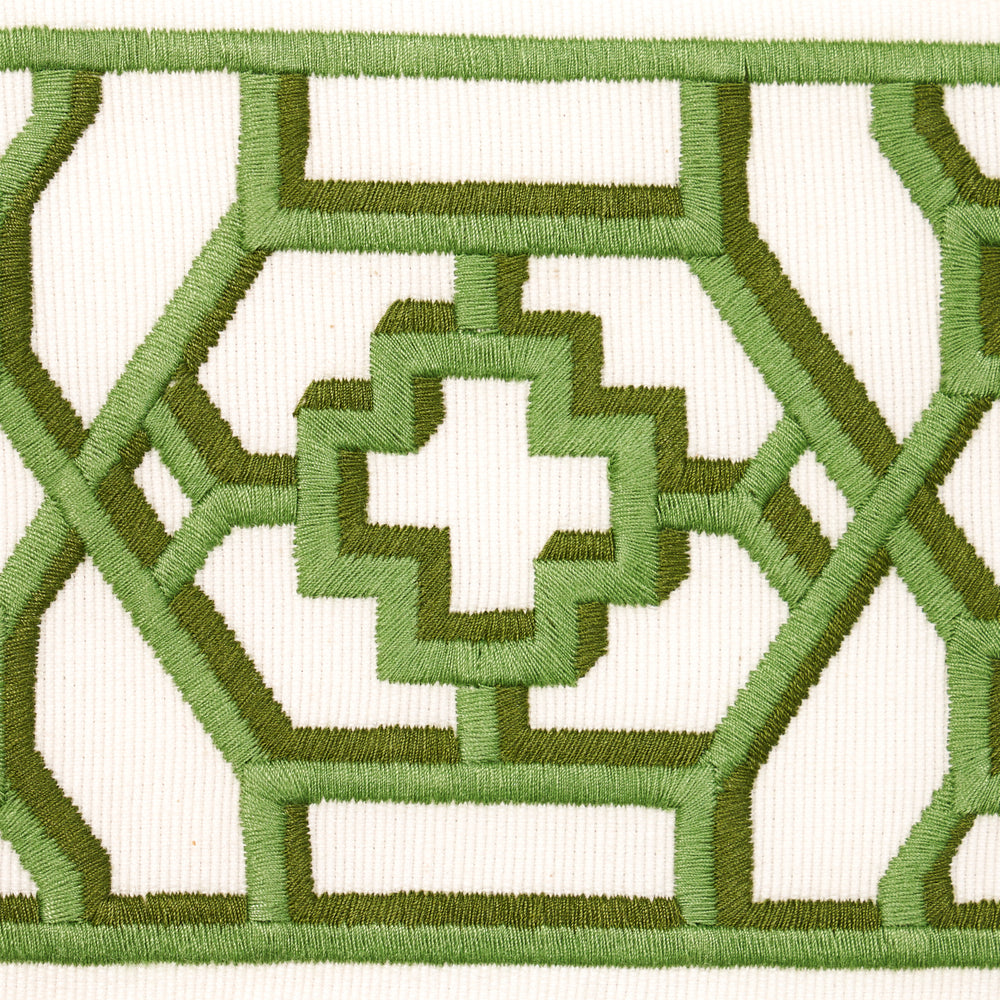 Inspired by Elsie de Wolfe's trellised rooms, Zanzibar Trellis Tape in jade is a fretwork pattern from the 1970s reimagined as a trim with modern, graphic appeal. A slight shadow effect gives it the depth of a trompe l'oeil painting. -