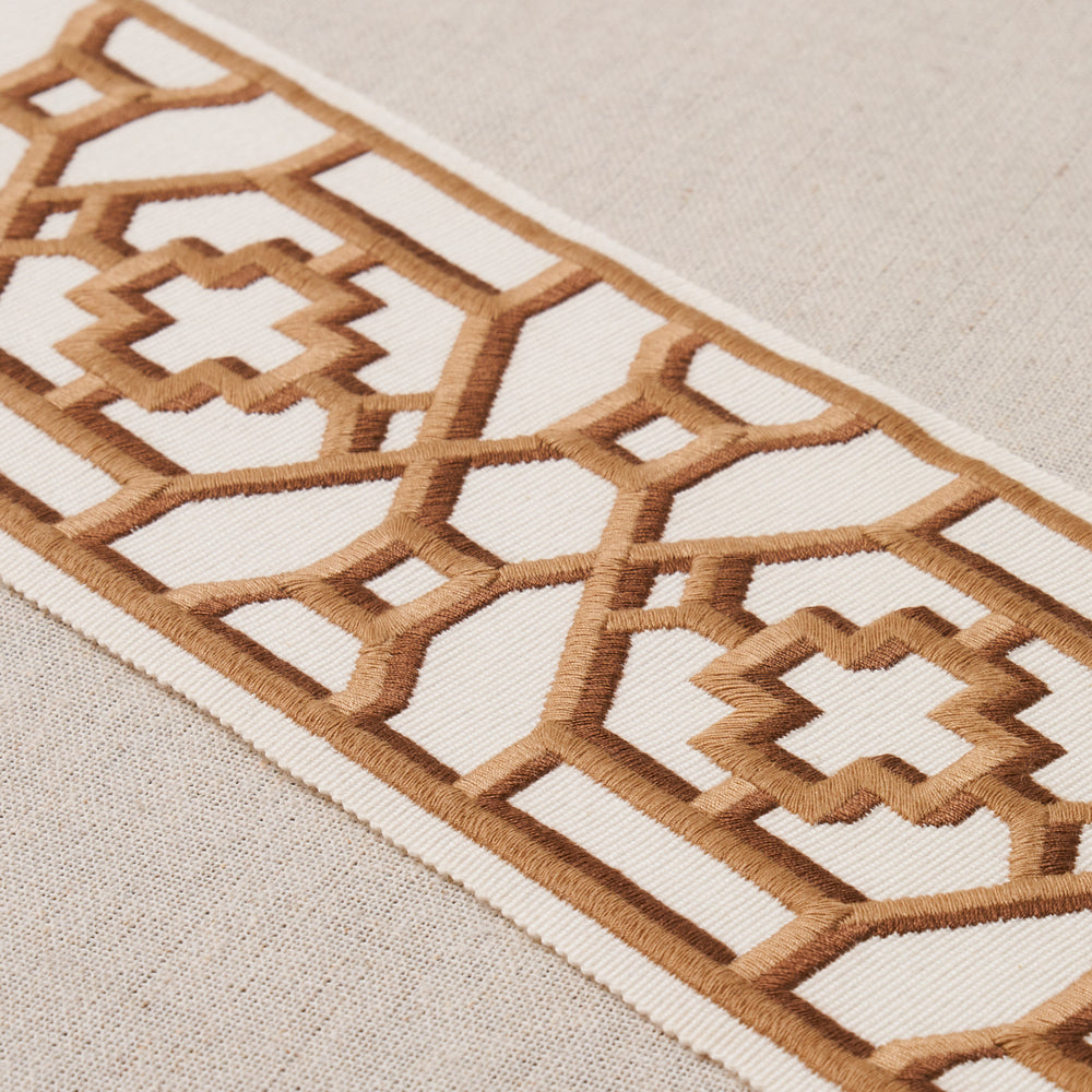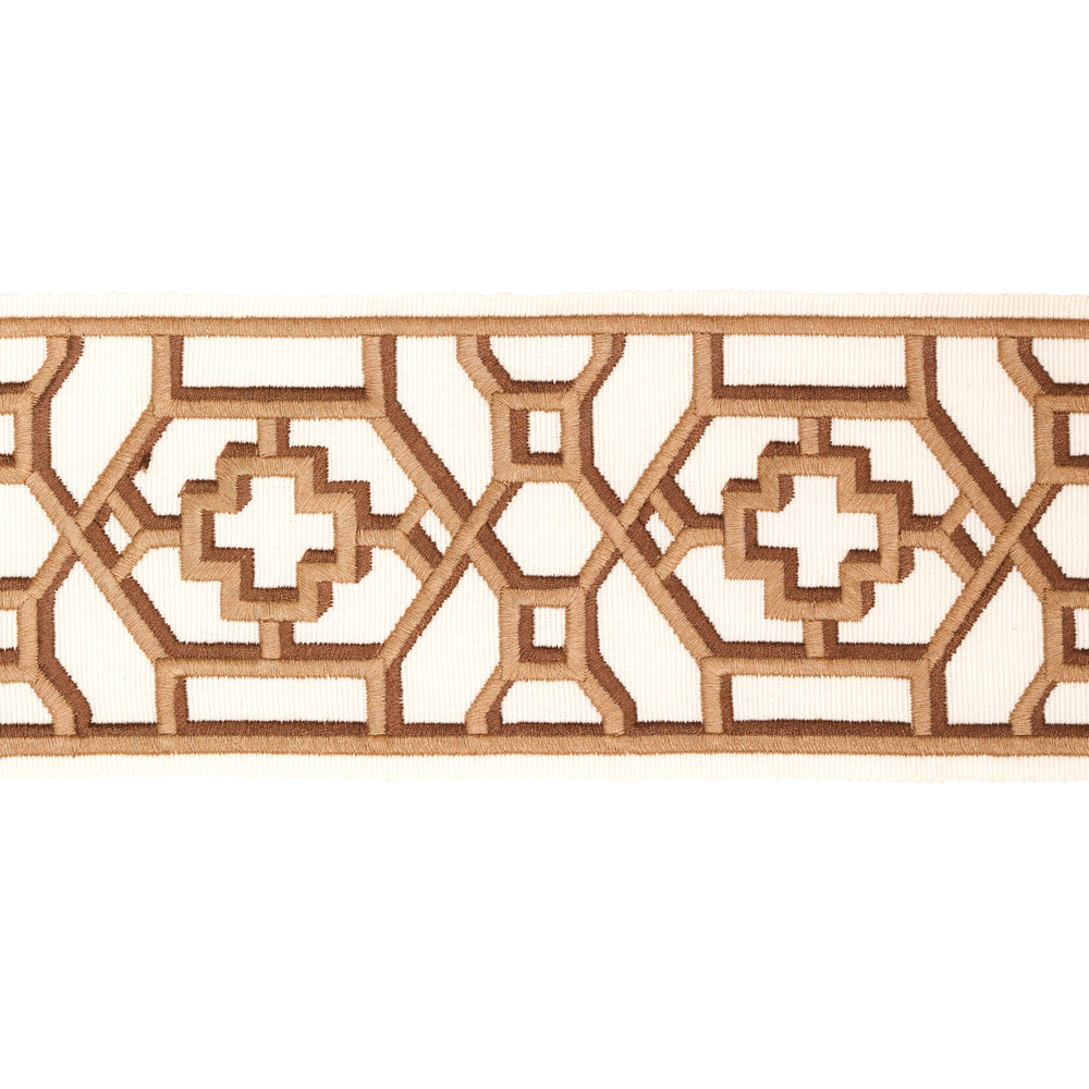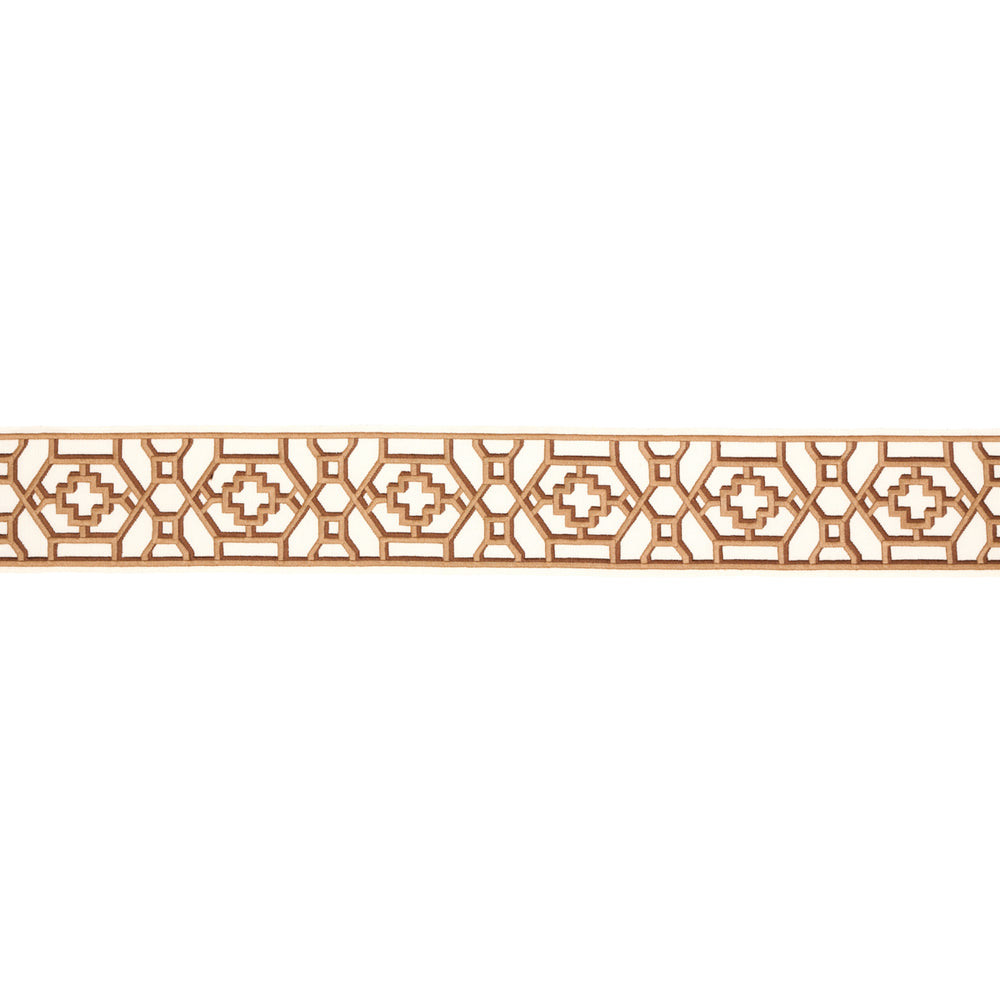Inspired by Elsie de Wolfe's trellised rooms, Zanzibar Trellis Tape in camel is a fretwork pattern from the 1970s reimagined as a trim with modern, graphic appeal. A slight shadow effect gives it the depth of a trompe l'oeil painting. -