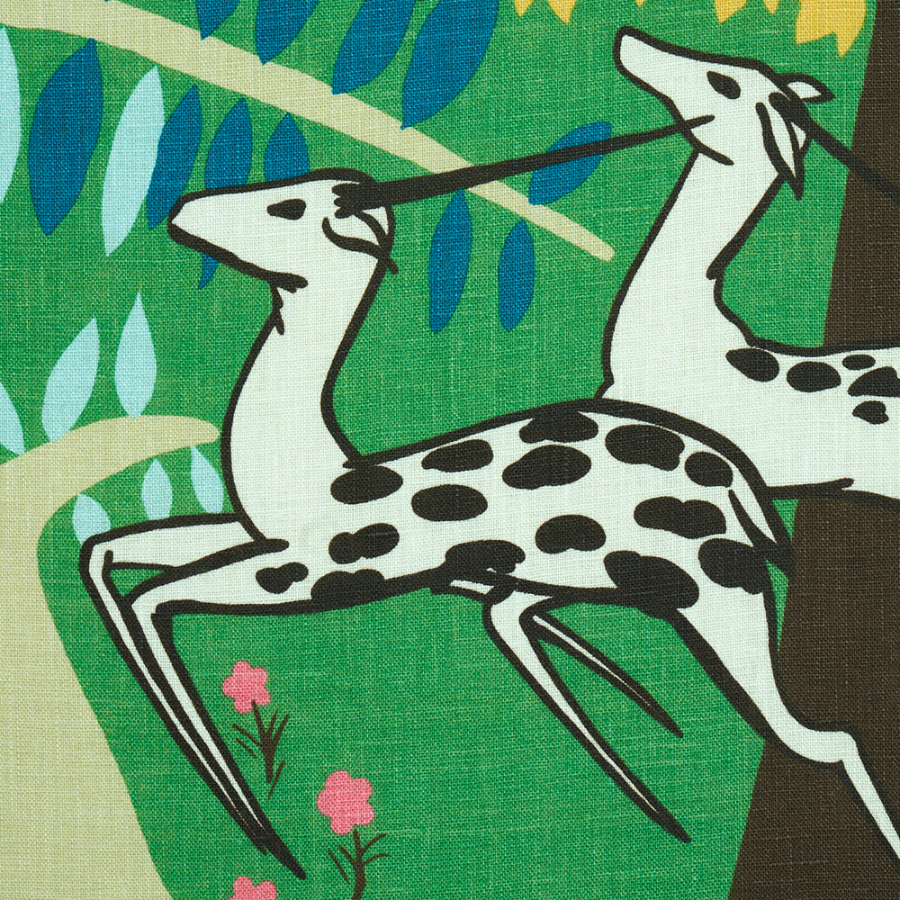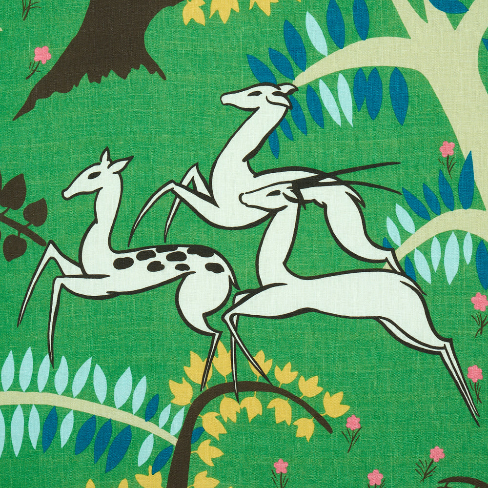 Graceful antelopes leap through an abstract, fantasy forest in this sleek design, created exclusively for Schumacher by Paul Poiret in 1930, and printed on textured linen. -