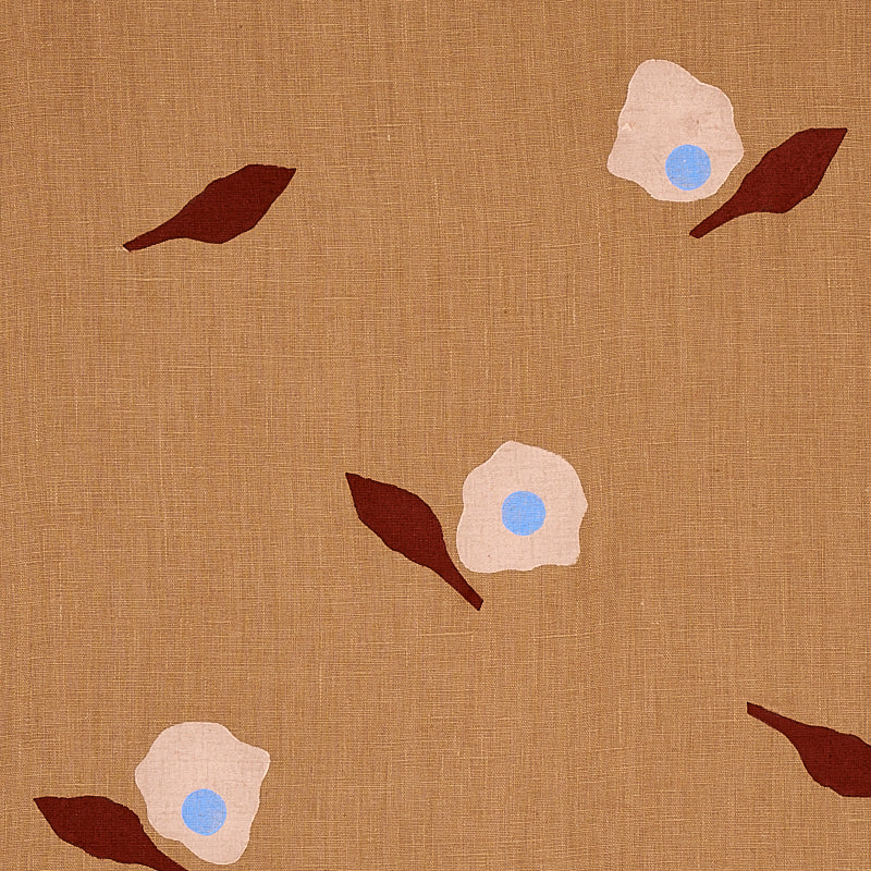 Designed by artist Caroline Z Hurley, Aquinnah is hand-block-printed in New Bedford, Massachusetts. With a bit of a 1930s feel, this camel-colored pattern features stylized medium-scale flowers and leaves scattered across a linen fabric.