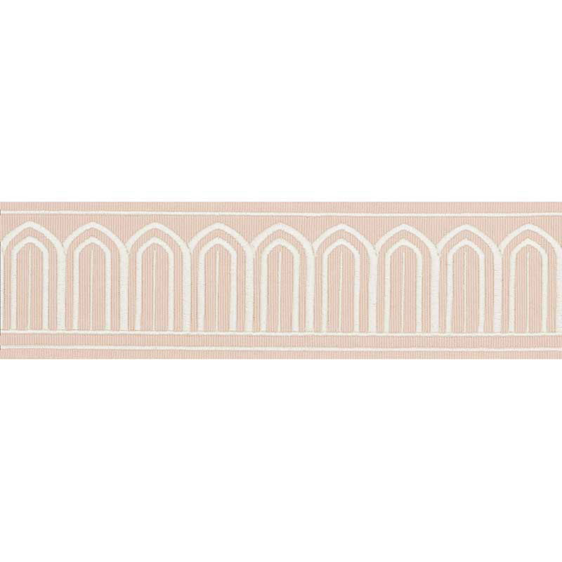 Designed by Miles Redd, Arches Embroidered Tape in blush is a stylized scallop trim that boasts undeniable architectural influences. Also available in a wider width.