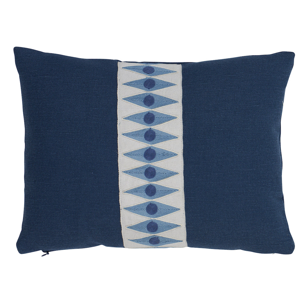 This pillow features Backgammon Tape by Mary McDonald for Schumacher with a knife edge finish. Mary McDonald was inspired by the alternating colors, pointed pips and circular pieces associated with backgammon when she created this fun, sophisticated design. Body of pillow is Langham High Performance Union. Pillow includes a feather/down fill insert and hidden zipper closure. -