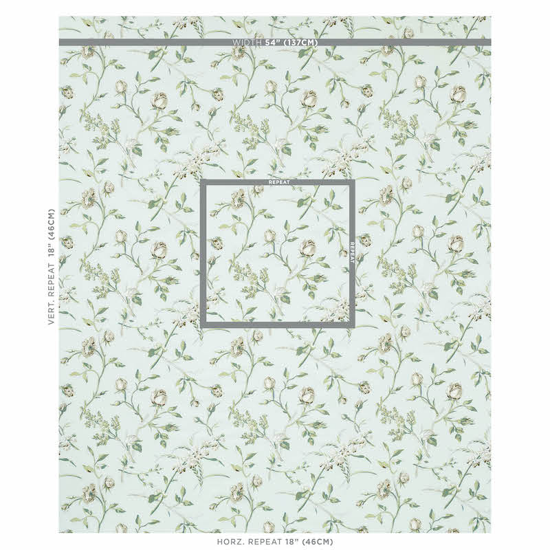A truly unique floral unlike any other in the Schumacher archive, this scattered toss of roses looks as if it was just gathered from an English garden, awaiting arrangement. Originating from the late 19th century, the multidirectional design is distinctly -