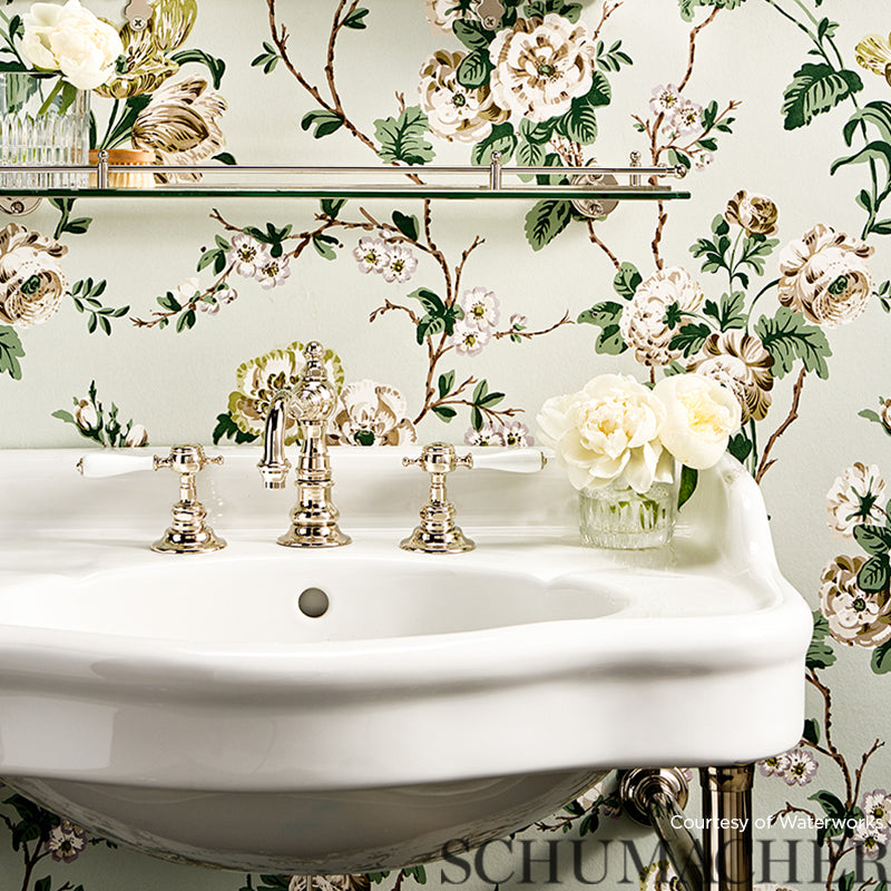 A lush tangle of tulips, roses and ranunculi climbs a trellis of branches in this gorgeous wallpaper design. Also available as a cotton chintz fabric. -