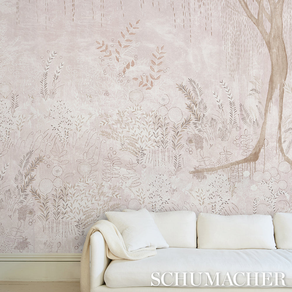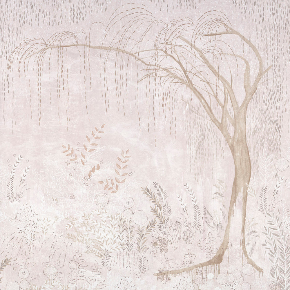 Printing California-based muralist Colette Cosentino’s gauzy weeping willow painting on a pearlized ground imparts a subtle shimmer to the subdued haziness of the landscape. Available in three non-repeating panels. -
