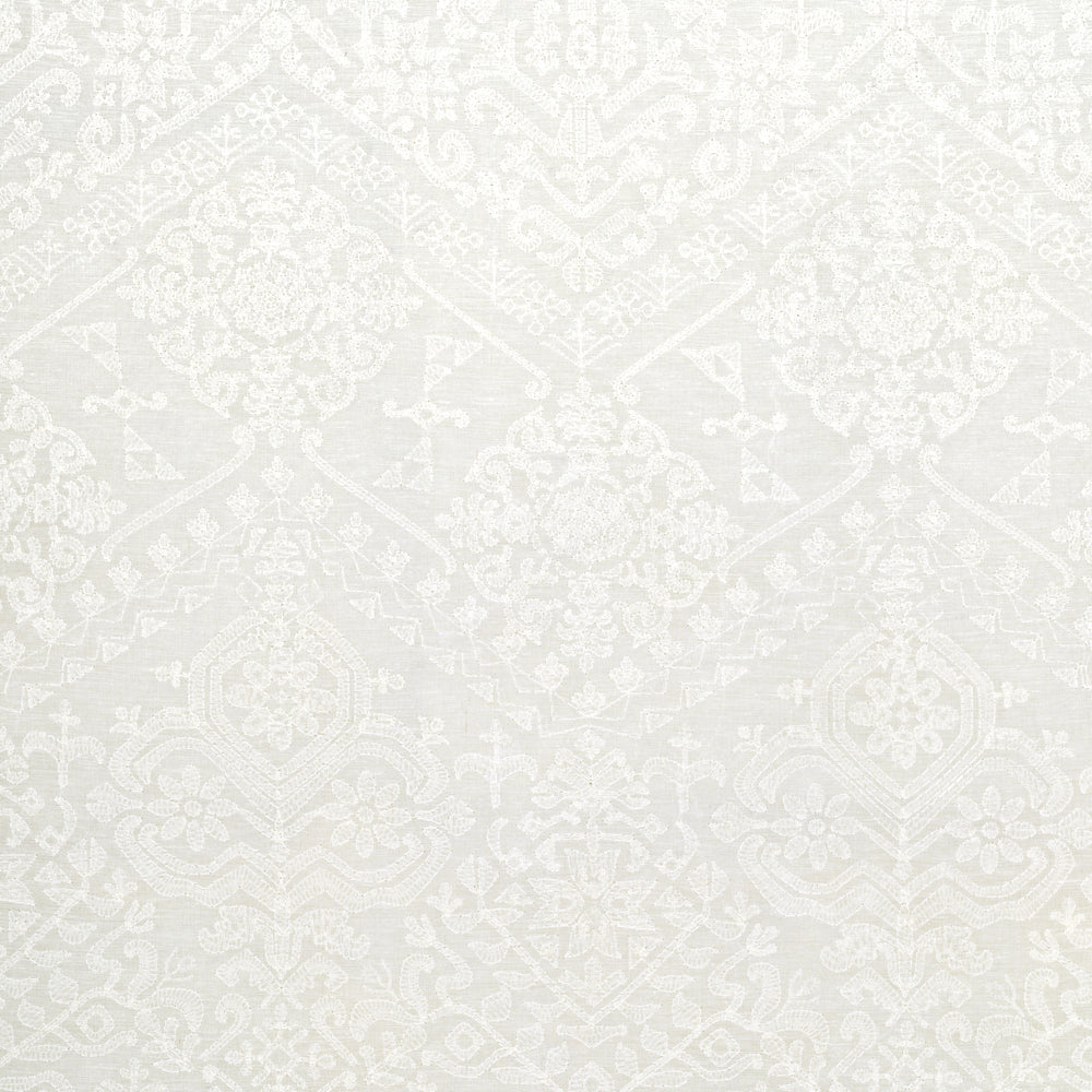 This delicate cotton-linen sheer features intricate, white on white embroidery. The large-scale, geometric floral has presence without overpowering. -