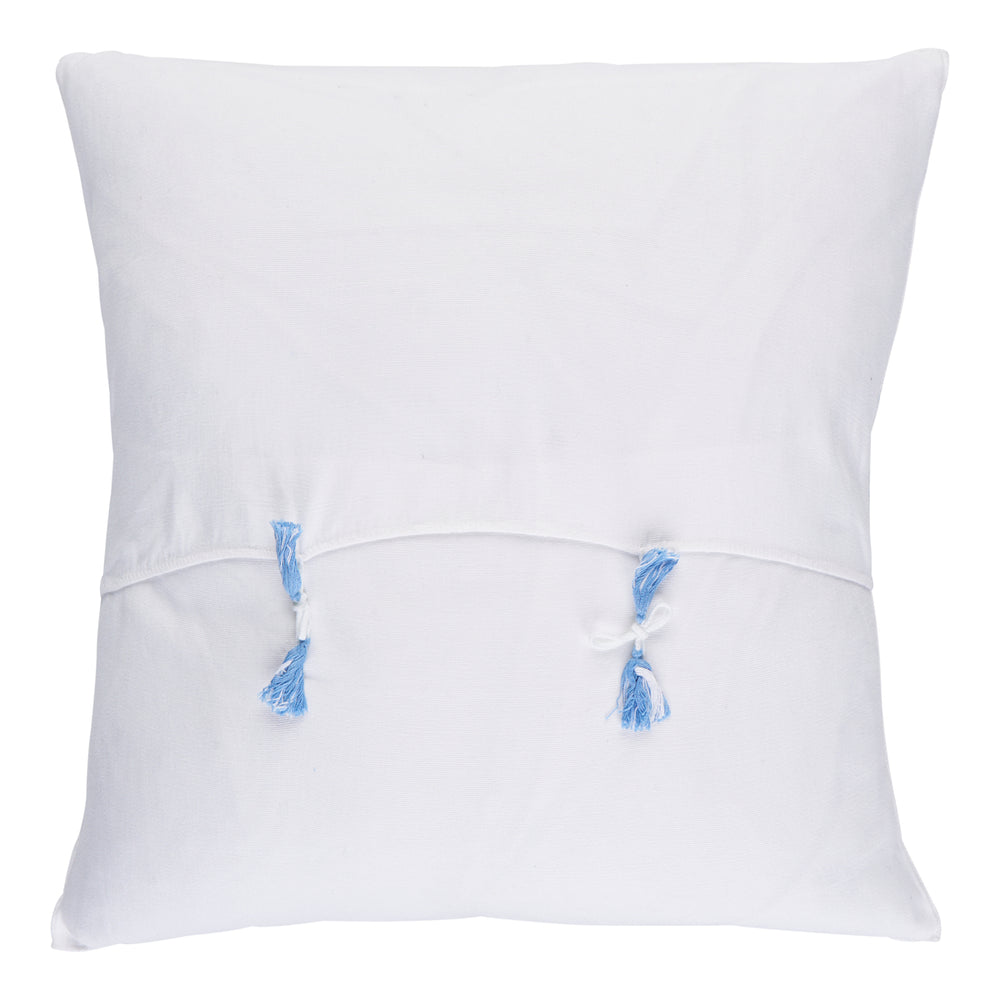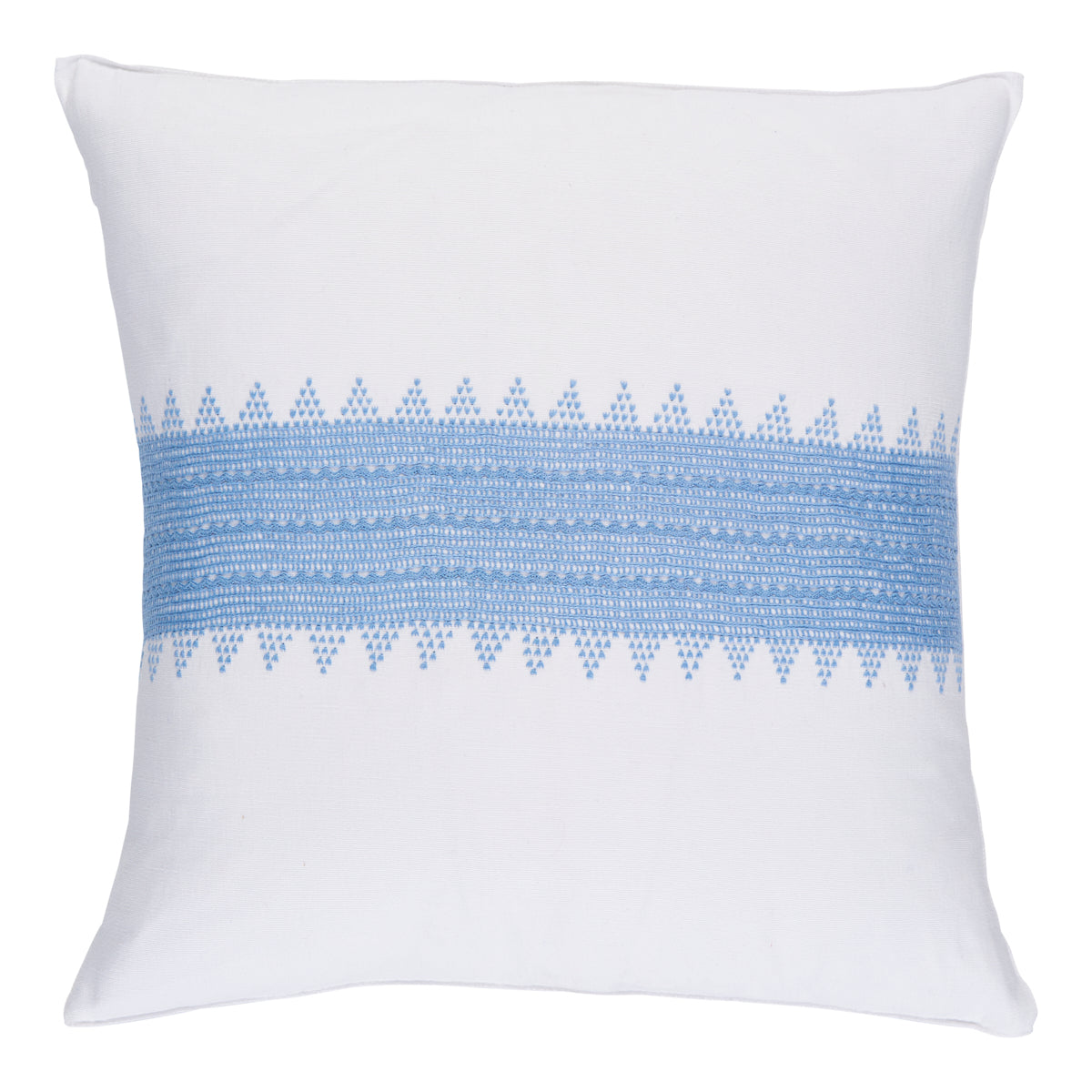The Chamula 20" pillow in Sky features intricate embroidery by a skilled collective of Maya women weavers. The pillow is finished with hand stitched sides and includes a plush feather insert. These artisanal pillows are made in the highlands of Chiapas, Mexico, using the traditional backstrap loom technique. Due to their handmade nature, expect slight variation in the color, pattern and size.. -