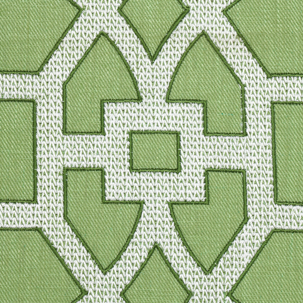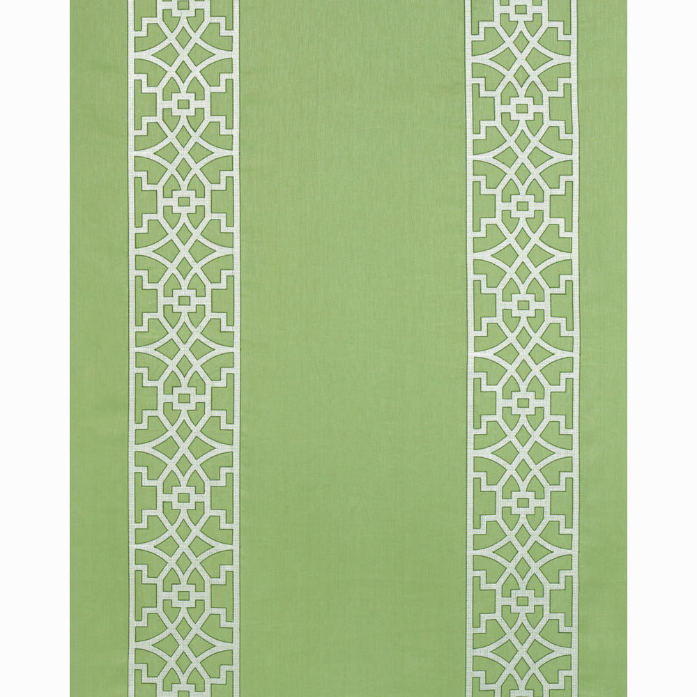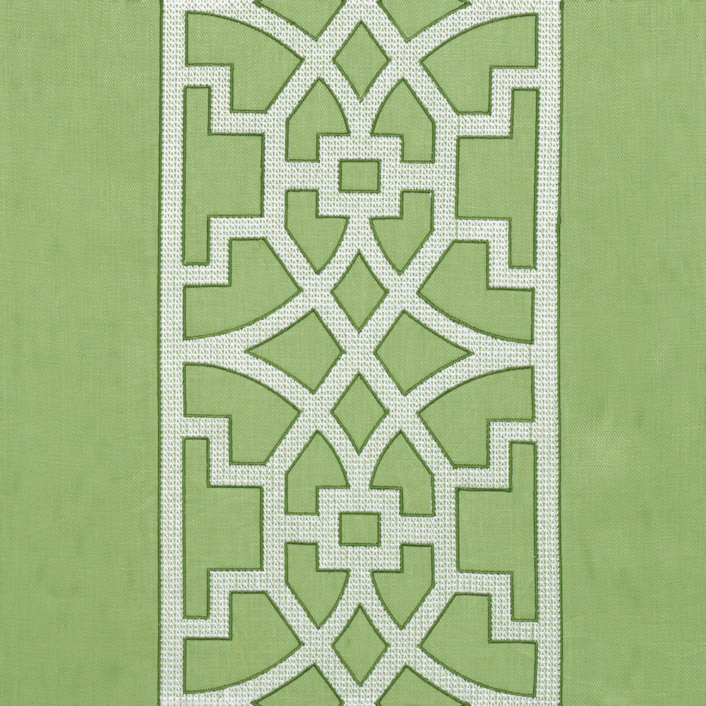 Traditional chinoiserie fretwork inspired this embroidered linen stripe. Subtle variations are part of its inherent natural beauty. -