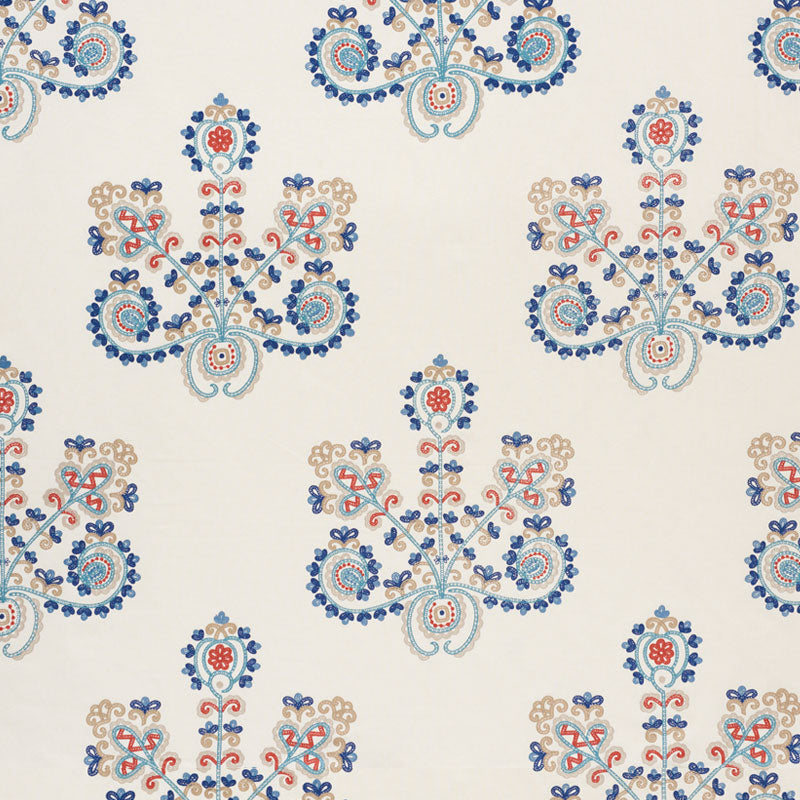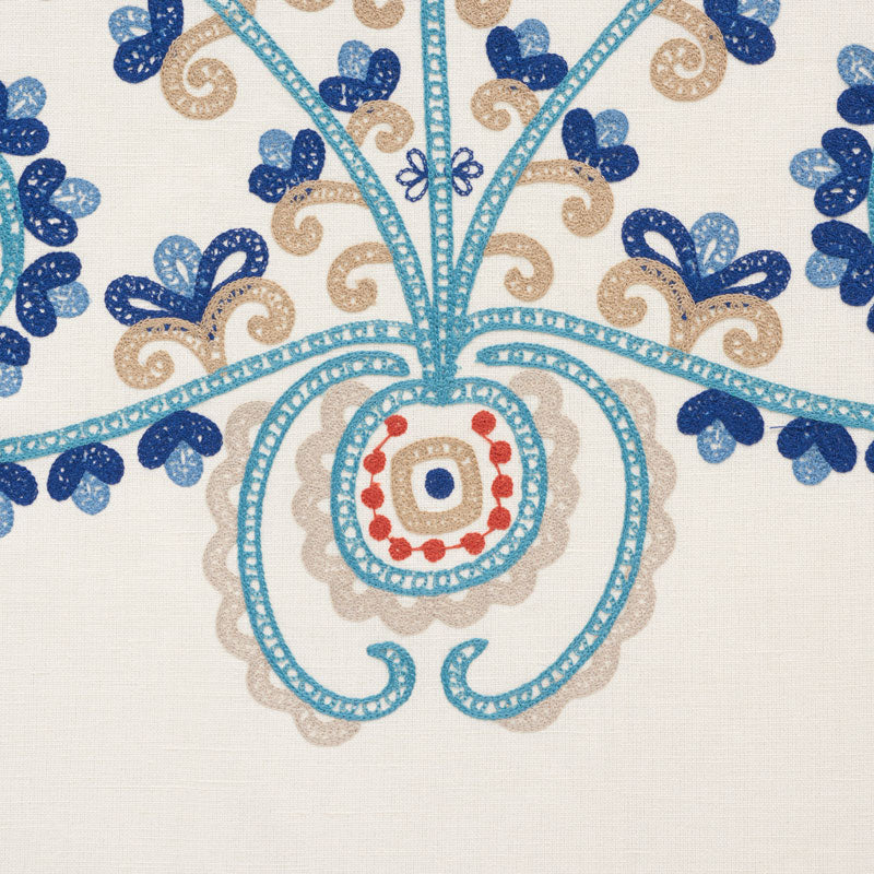 Estrella's stylized floral motifs are delicately embroidered on a cotton-linen ground. Its open design layers beautifully with other patterns. -