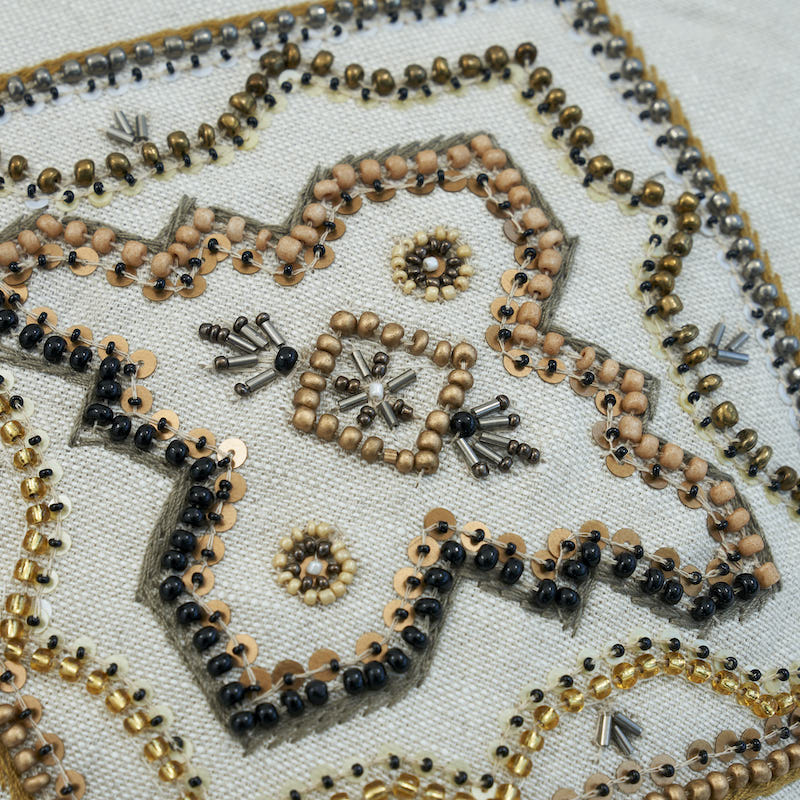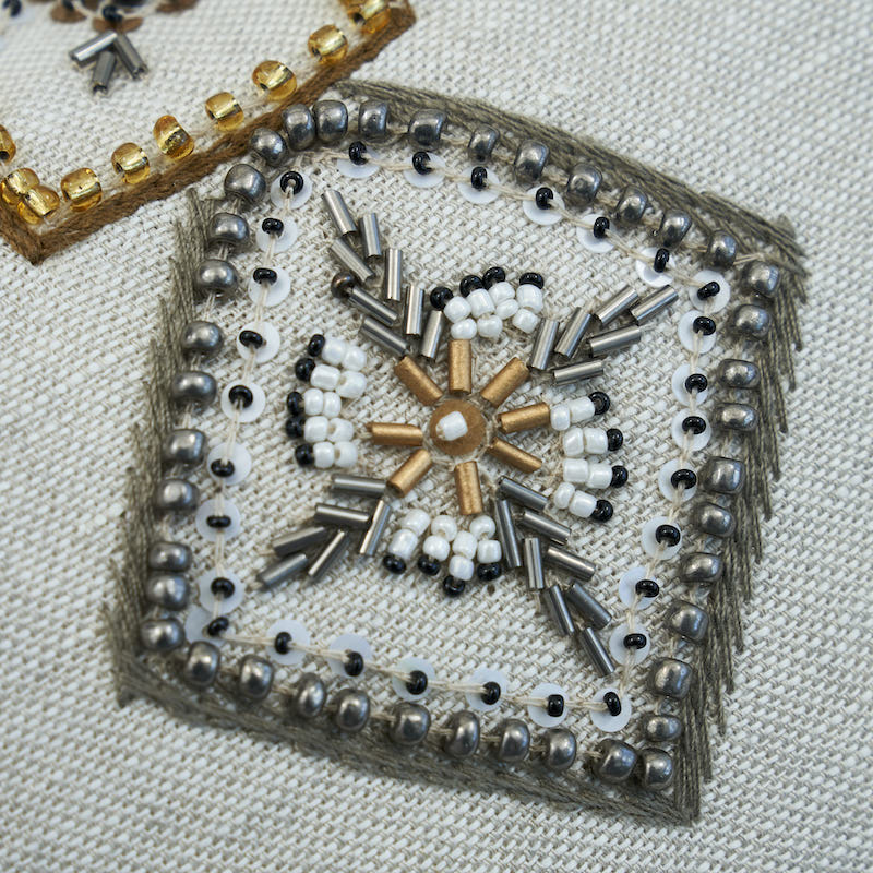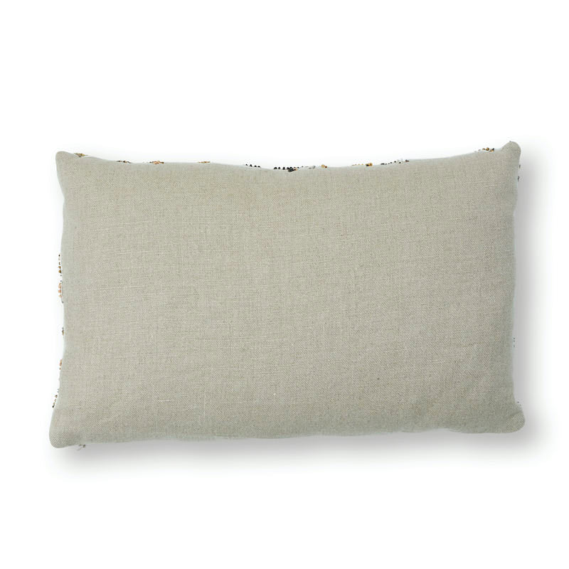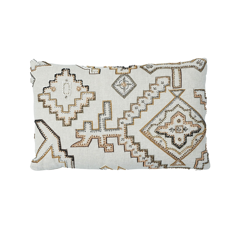 This pillow features Ezma Embroidery with a Knife Edge finish. Each and every one of the beads on this dazzlingly chic tribal geometric is sewn by hand, making it a true tour de force of artistry and style. Back of pillow features Piet Performance Linen. Pillow includes a feather/down fill insert and hidden zipper closure. -