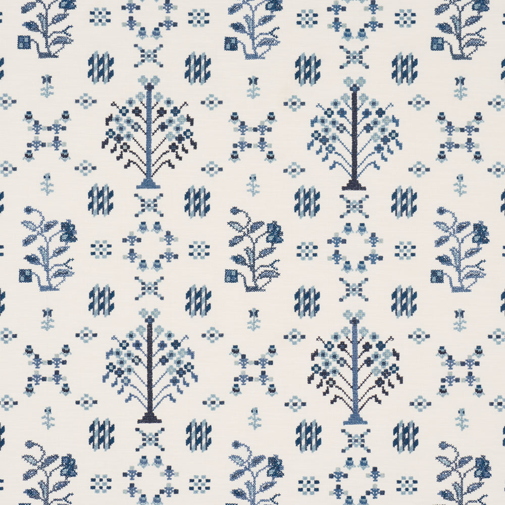 Fairview Cross Stitch Embroidery is a medium-scale design imbued with folk-art charm. Stitched on a slubbed cotton ground, this fabric’s stylized flowers and geometric flourishes lend a happy homespun look to window treatments, pillows, and furniture. -