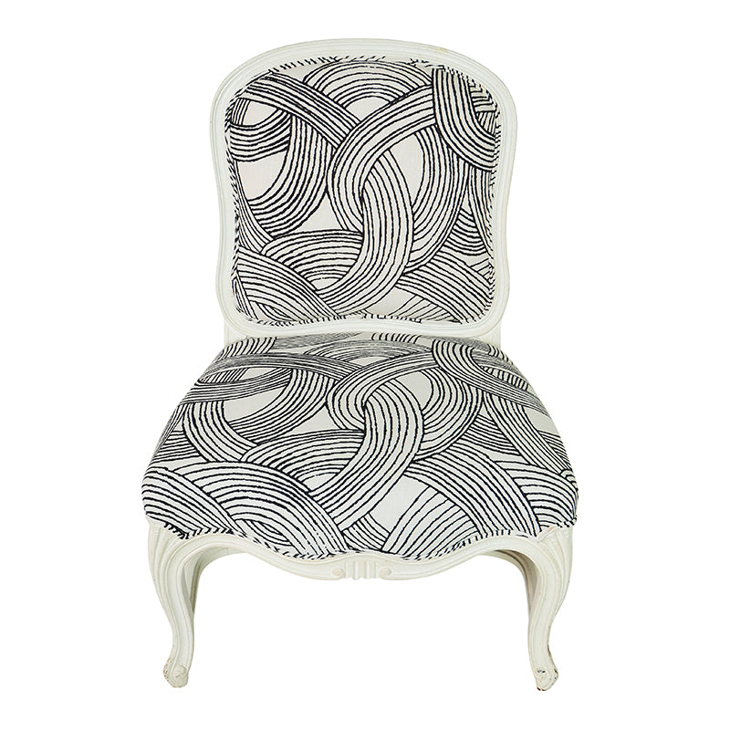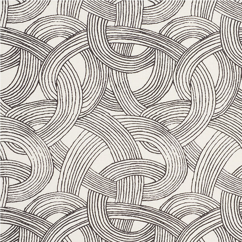 Freeform features a dynamic scrolling, curvilinear pattern printed on a linen ground. Its large, intertwining repeat makes it especially wonderful for curtains. -