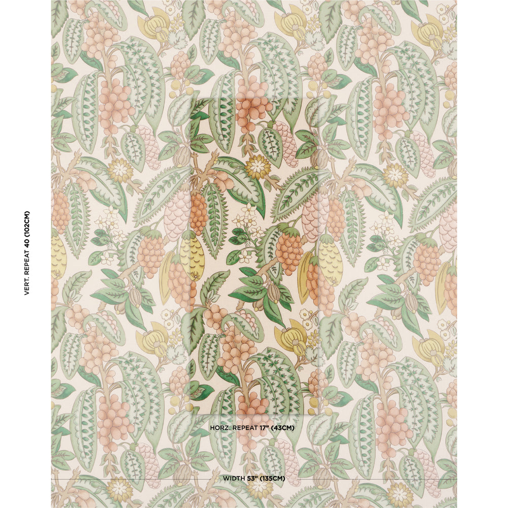 Created in collaboration with Timothy Corrigan, Fruits de Saison is an exuberant large-scale pattern that embraces a sense of joy and abundance. This enchanting botanical, with its fanciful fruit-bearing and flowering trees, has a playful spirit and wonderful hand-painted look. -