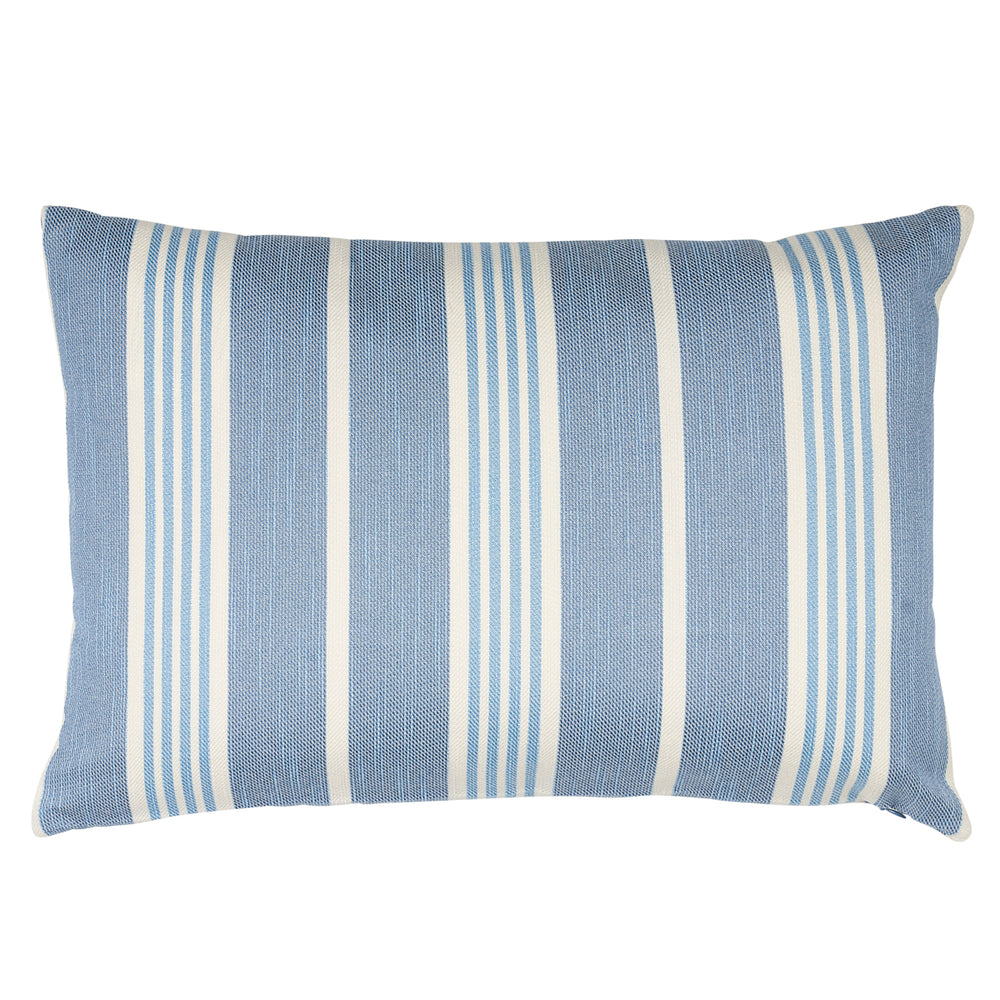 This pillow features Hampton Stripe Indoor/Outdoor by Mary McDonald for Schumacher with a knife edge finish. Smart and sturdy, Hampton Stripe Indoor/Outdoor in pool is a wonderfully versatile fabric design by Mary McDonald. The slubby high-performance twill resists stains, moisture, mildew and fading. Pillow includes a polyfill insert and hidden zipper closure. -