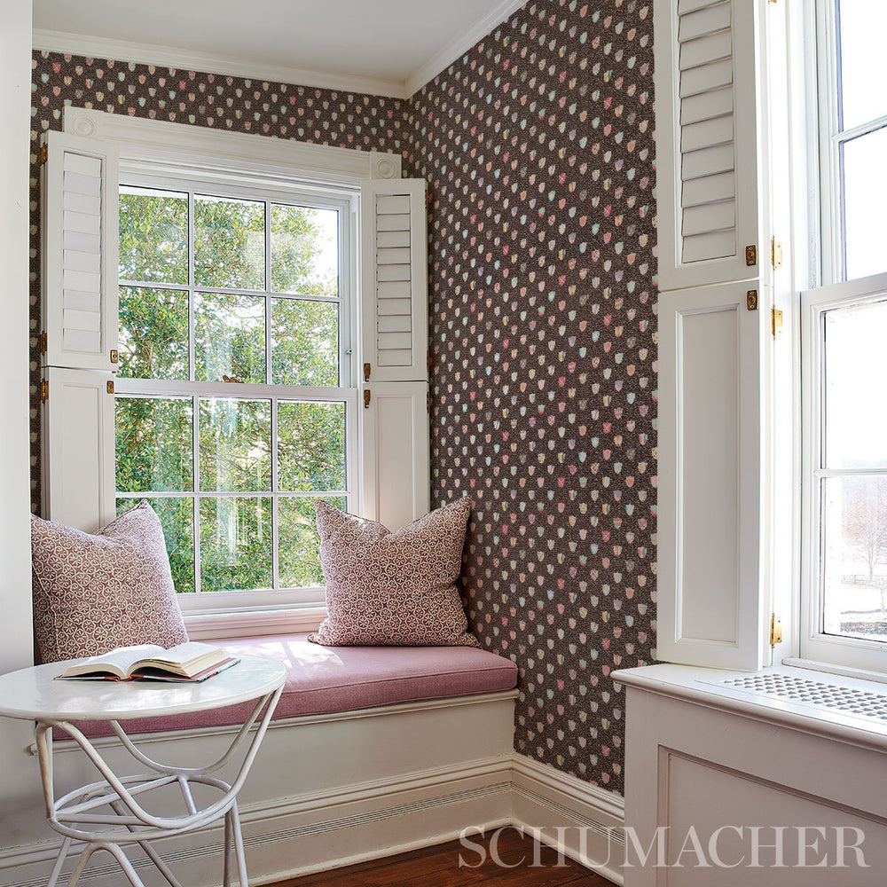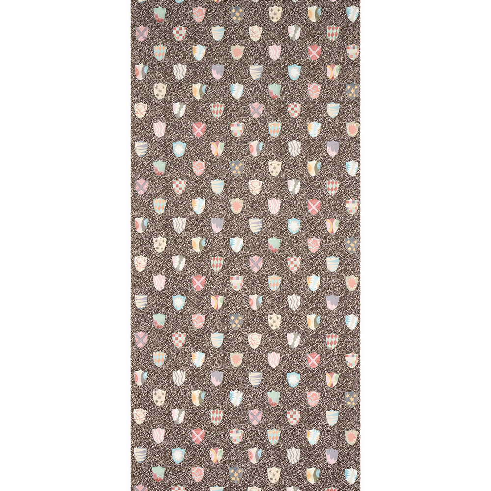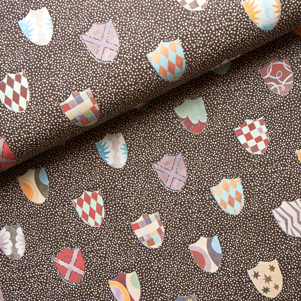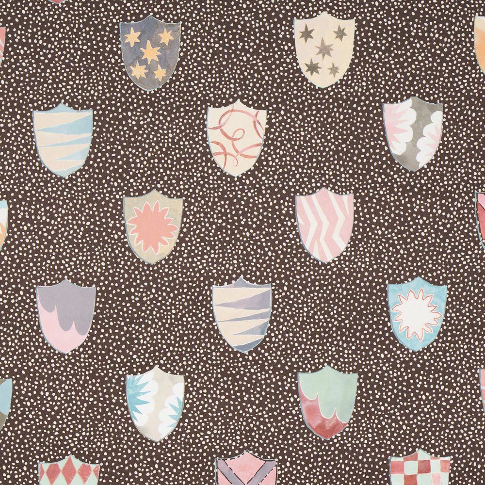 A delightful mid-scale wallpaper designed by Happy Menocal, Heraldic in brown breathes new life and levity into an ancient aristocratic motif. Colorful shields featuring whimsical patterns are rendered with a painterly hand against a mottled background. Also available as a fabric. -