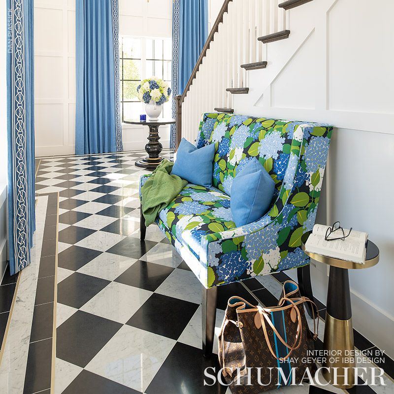 In this painterly, large-scale design, which Paul Poiret created exclusively for Schumacher in 1930, showstopping clusters of hydrangea pop against a cotton-linen ground. -