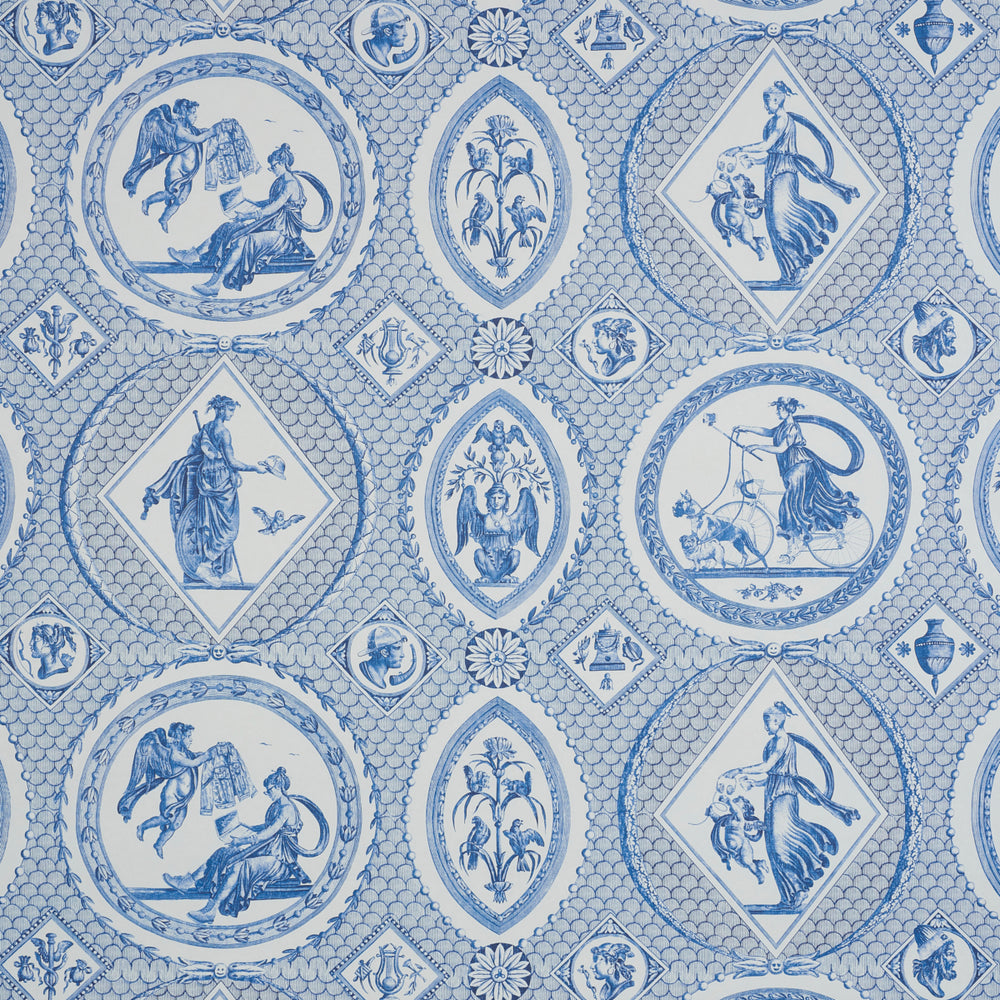 For a tongue-in-cheek take on antiquity, our in-house artists contemporized an 18th-century Jean-Baptiste Huët pattern by seamlessly embedding contemporary references—everything from combat boots to to-go coffee cups—into Greco-Roman mythological vignette -