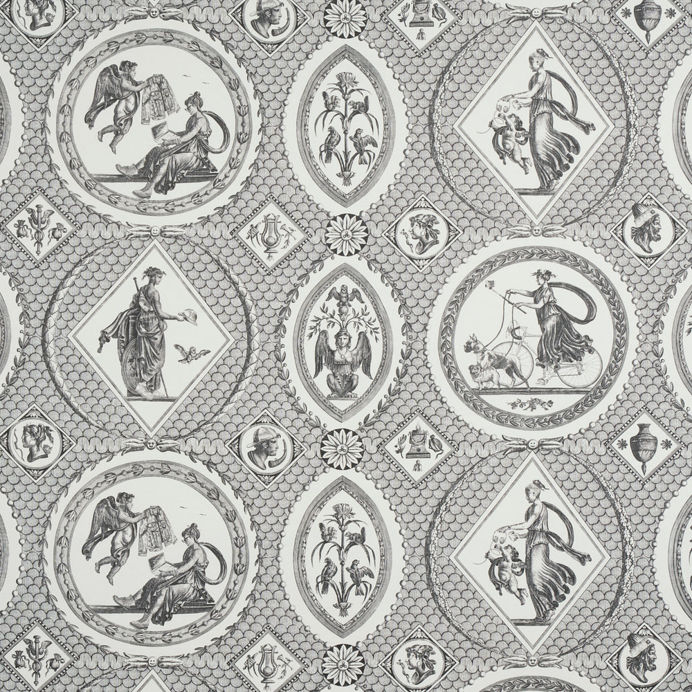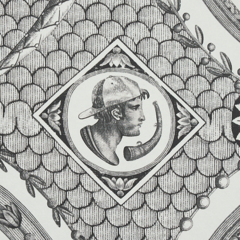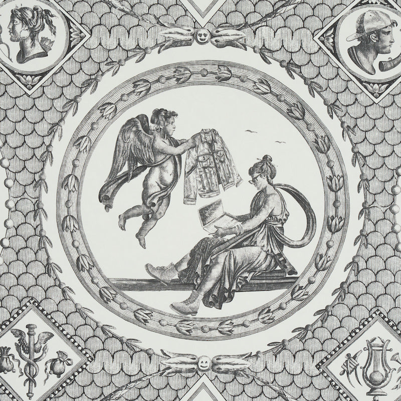 For a tongue-in-cheek take on antiquity, our in-house artists contemporized an 18th-century Jean-Baptiste Huët pattern by seamlessly embedding contemporary references—everything from combat boots to to-go coffee cups—into Greco-Roman mythological vignette -