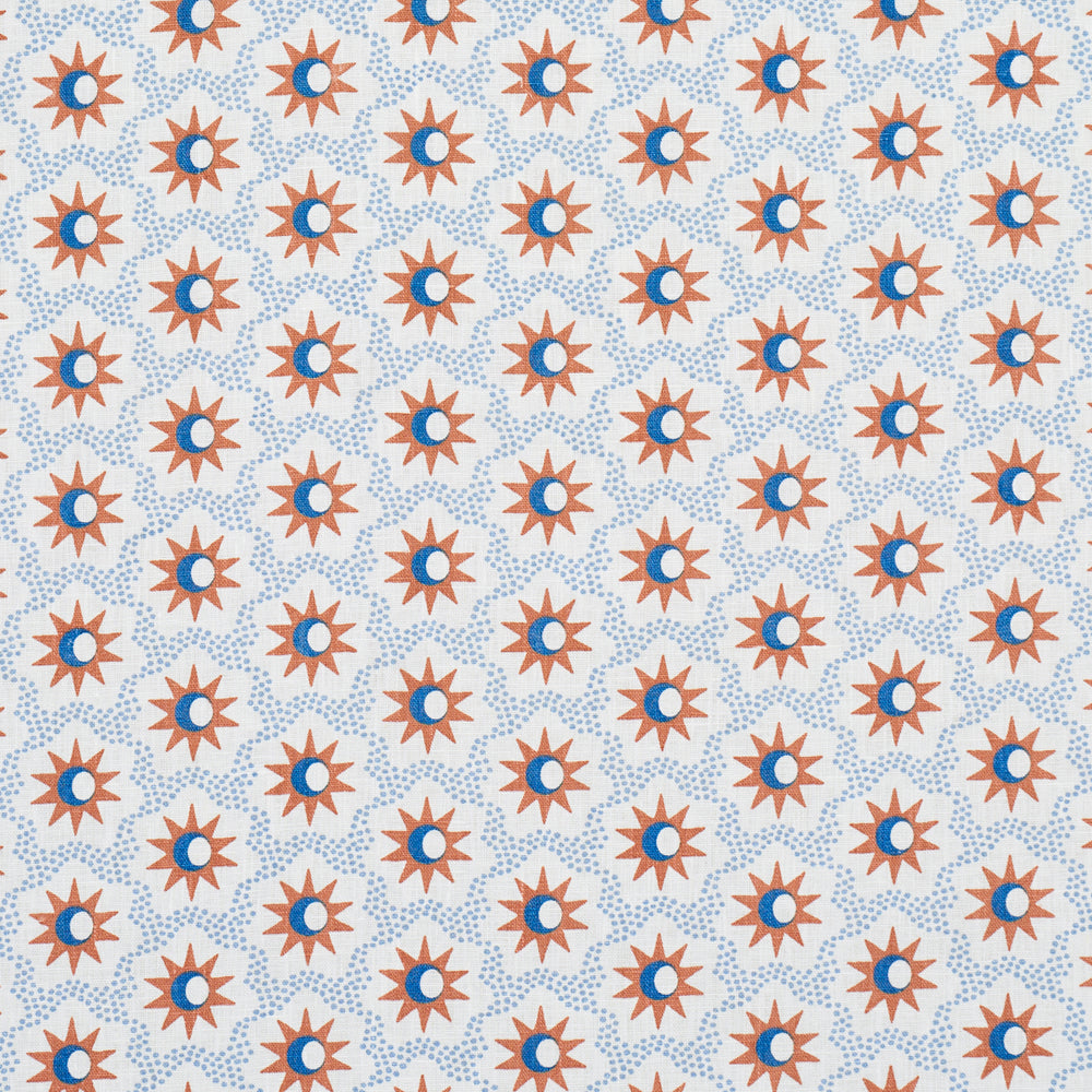 The lively starbursts and crescent moons of Lucie fabric add celestial charm to any scheme. Printed on a 100% linen ground, this graphic small-scale design has endless appeal and infinite uses, from pillows and window treatments to upholstered pieces, large and small. Also available as a wallpaper. -