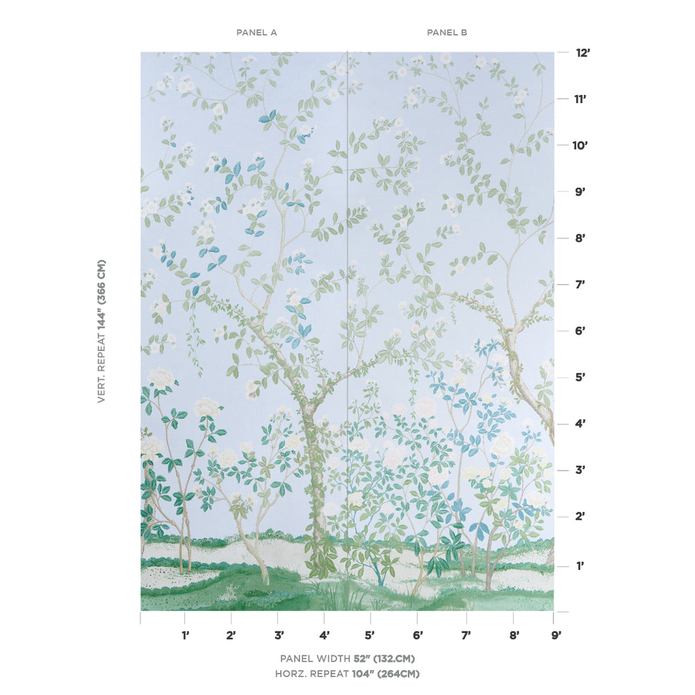 English garden meets Chinoiserie in this stunning blue design. Originally drawn to scale on French canvas, this vast floral pattern is comprised of two 12' panels.