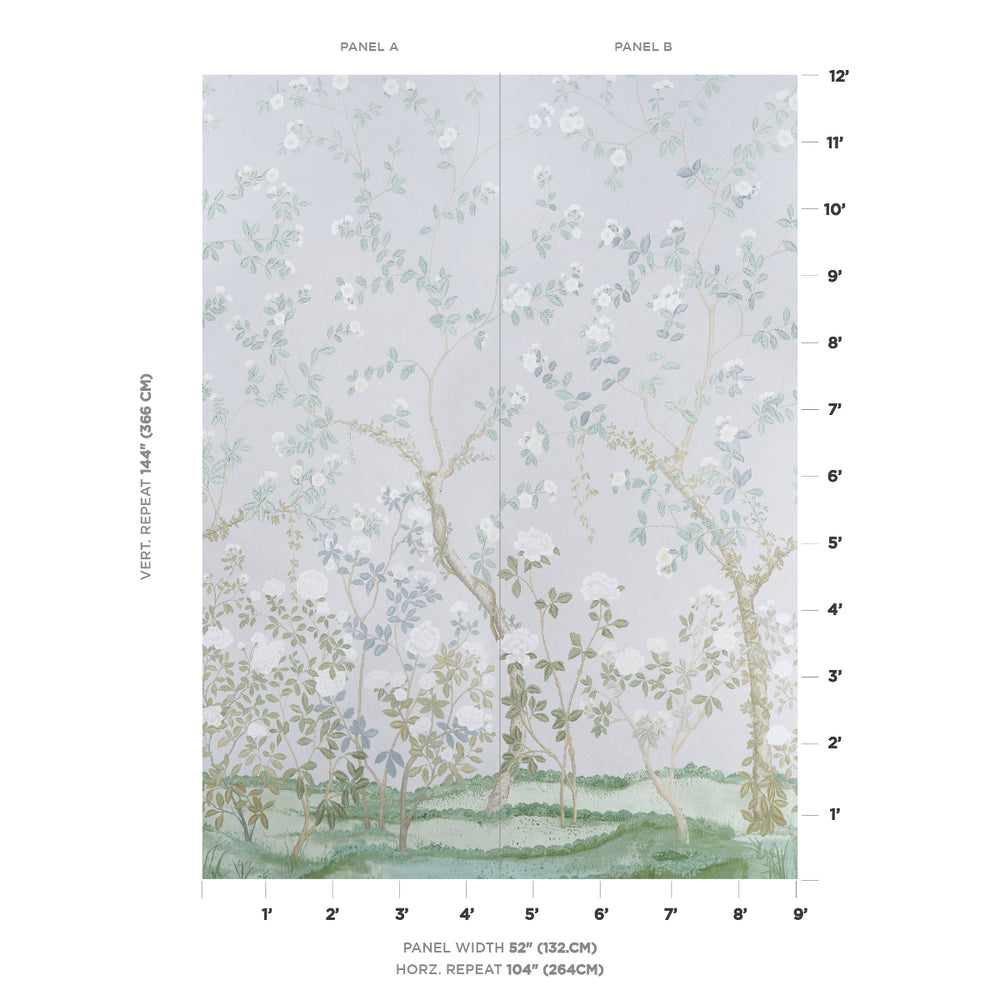 English garden meets Chinoiserie in this stunning grey design. Originally drawn to scale on French canvas, this vast floral pattern is comprised of two 12' panels.
