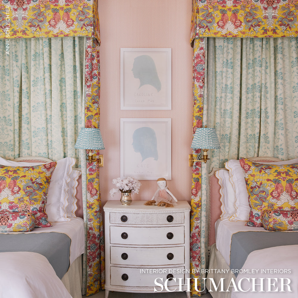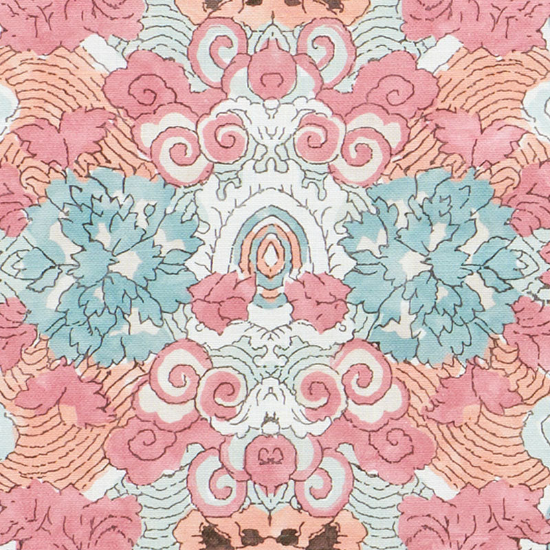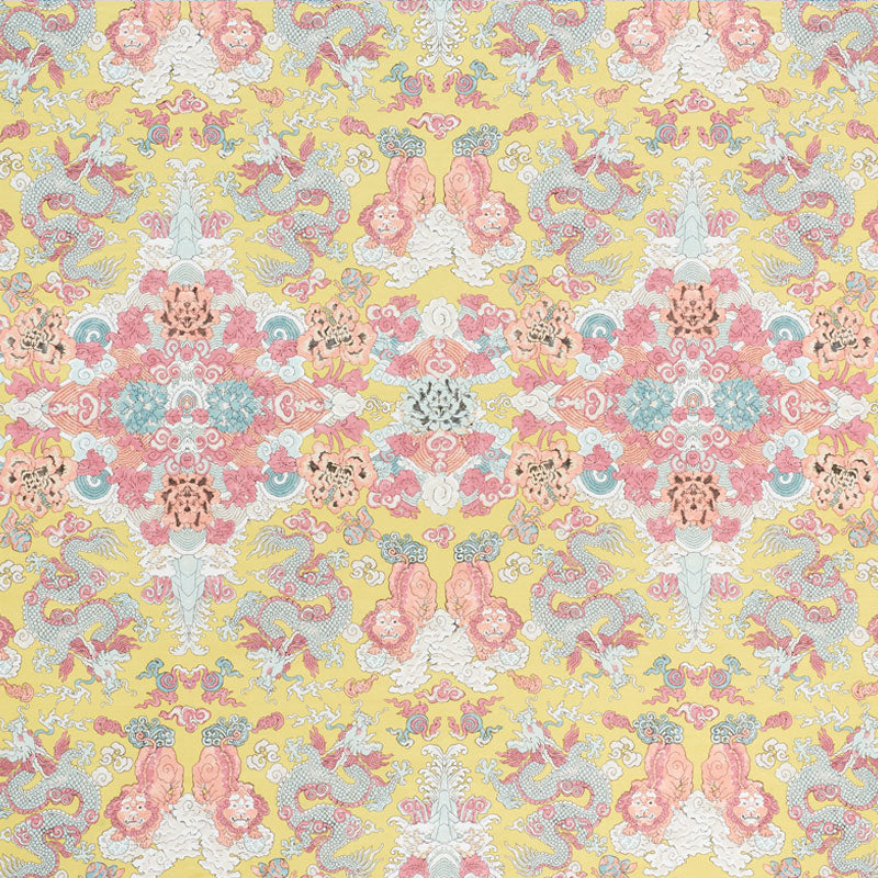 Foo dogs and fire-breathing dragons animate this fantastic, symmetrical print on a linen ground. It's an adventurous and exotic pattern that makes a memorable statement. -