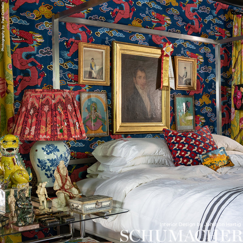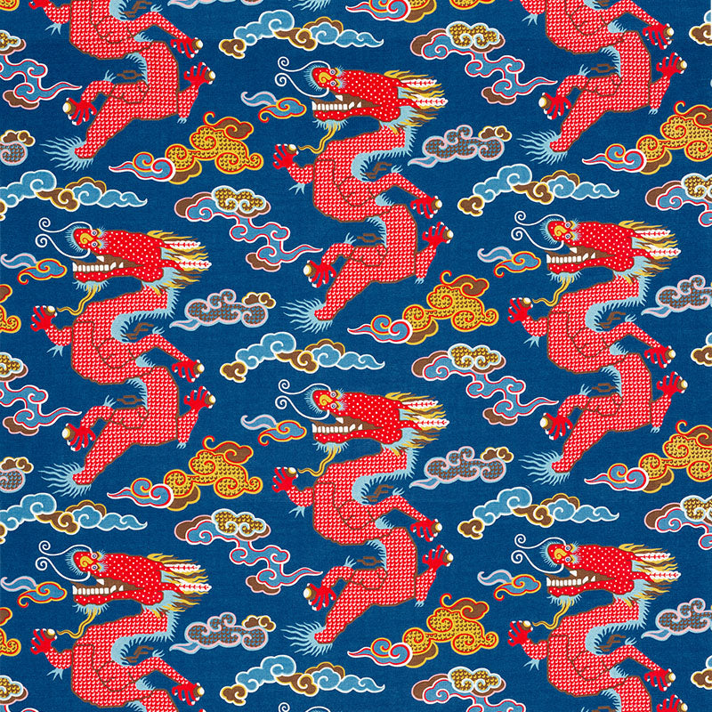 Hand printed, stylized dragons are the centerpiece of this Tibetan-inflected fabric that’s been rendered in a head-turning scale, complete with atmospheric clouds. Also available as a wallcovering. -