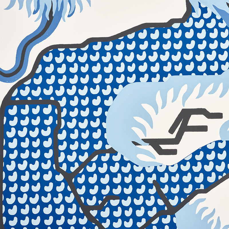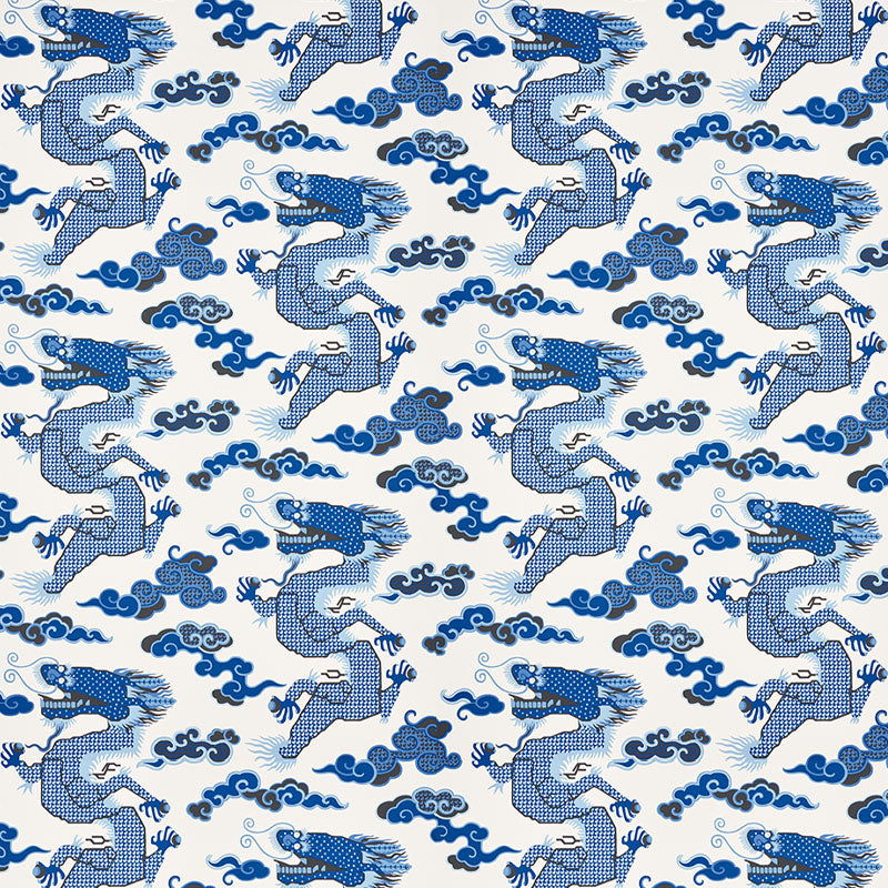 Hand printed, stylized dragons are the centerpiece of this Tibetan-inflected wallcovering that’s been rendered in a head-turning scale, complete with atmospheric clouds. Also available as a fabric. -