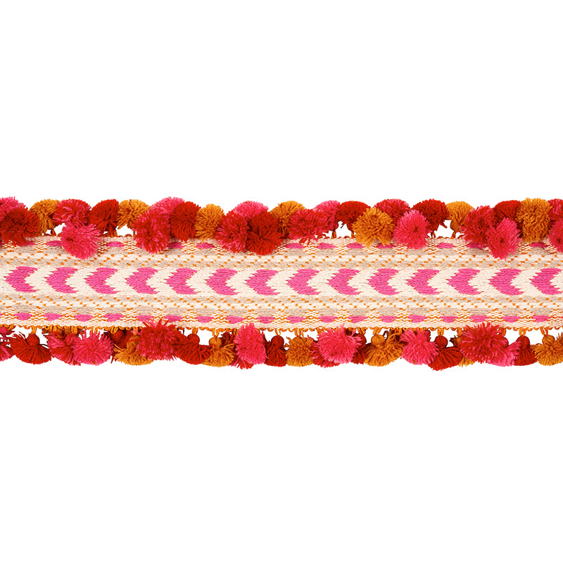 Inspired by traditional Peruvian textiles, Maracana Pom is a dimensional woven trim with playful, multi-colored pom-poms. Stylish and textural, it's a striking finishing touch. -